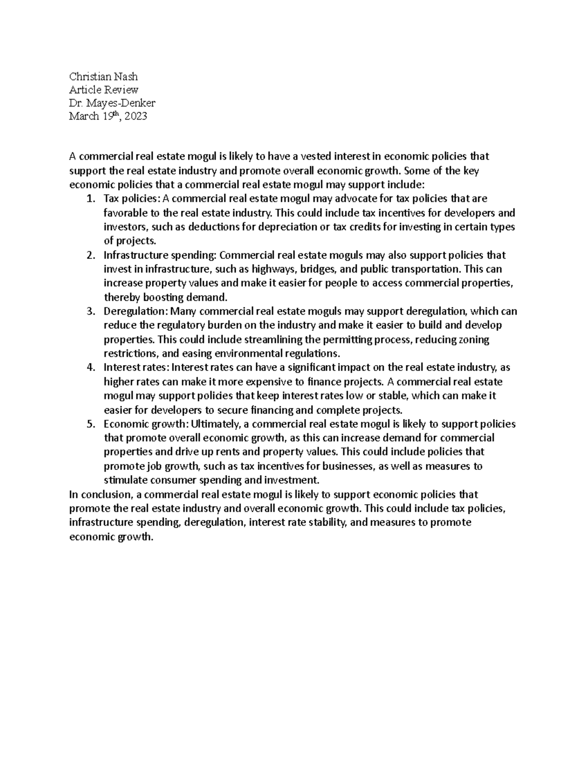 ECON 412 N/A Christian Nash Article Review Dr. MayesDenker March