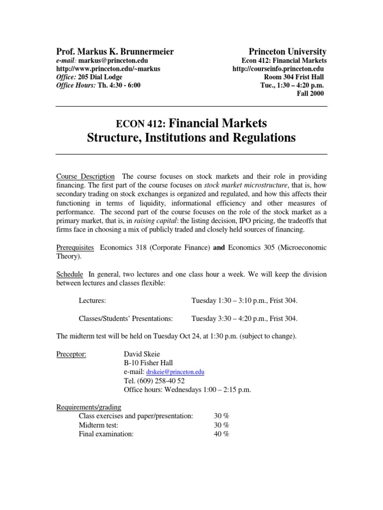 Financial Markets Structure, Institutions and Regulations ECON 412