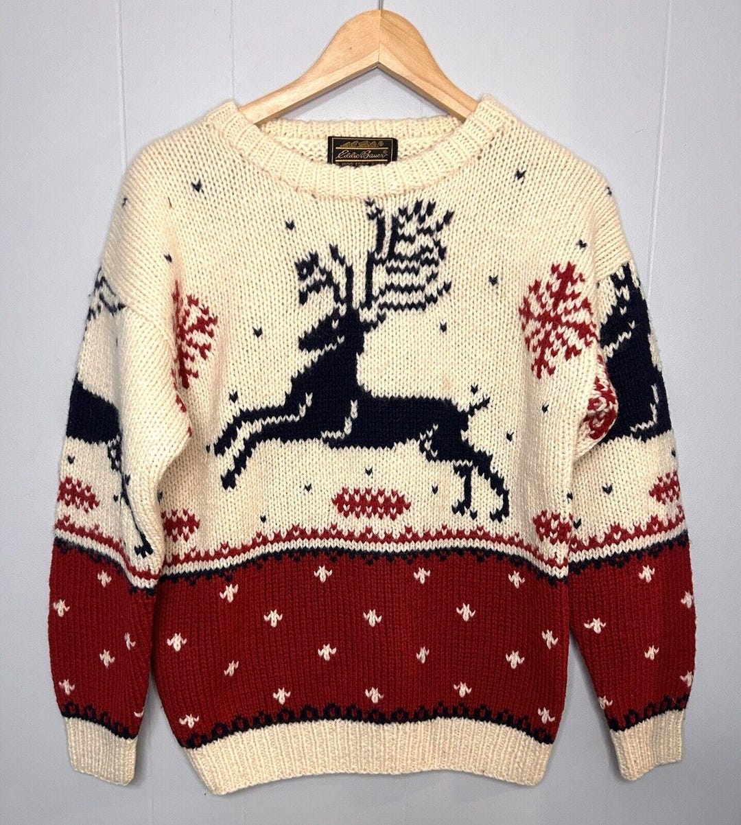 Vintage Eddie Bauer Christmas Reindeer Long Sleeve Sweater 100 Wool