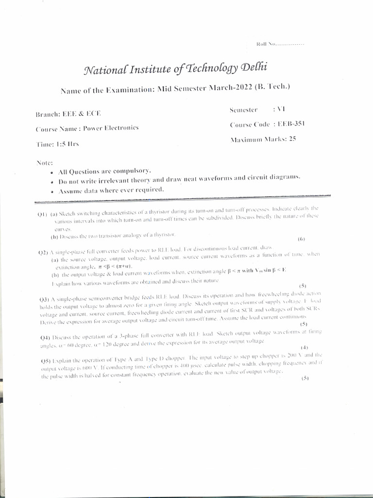 Power Electronics Course Code EEB351 Mid Sem .Exam 2022 PDF