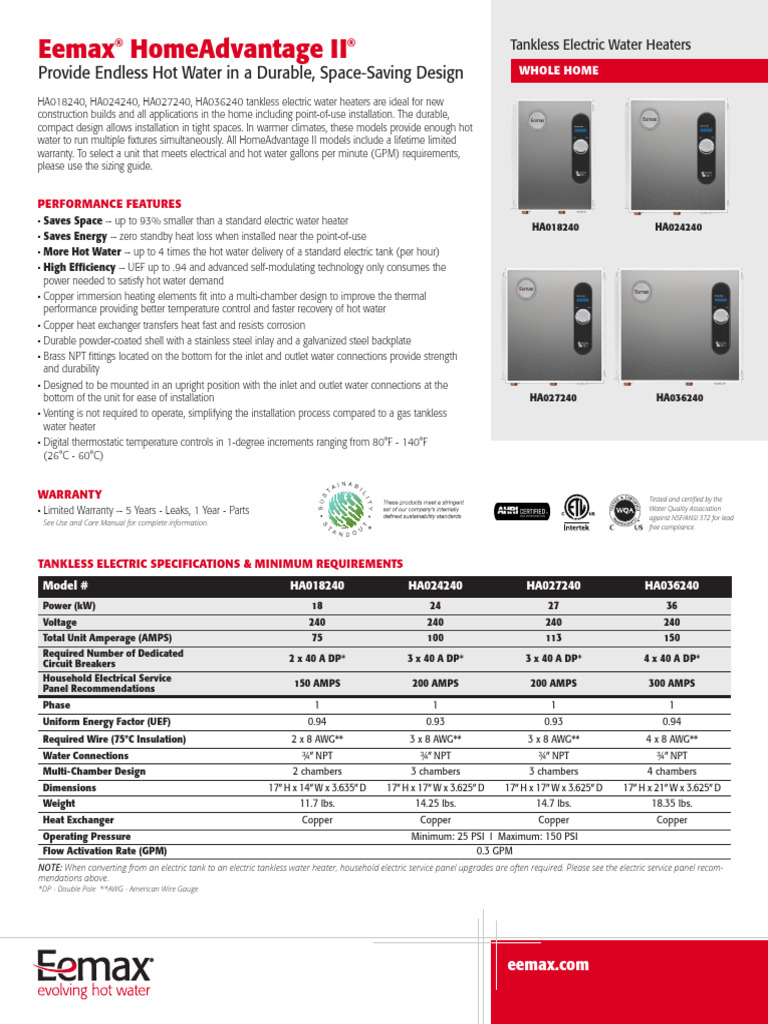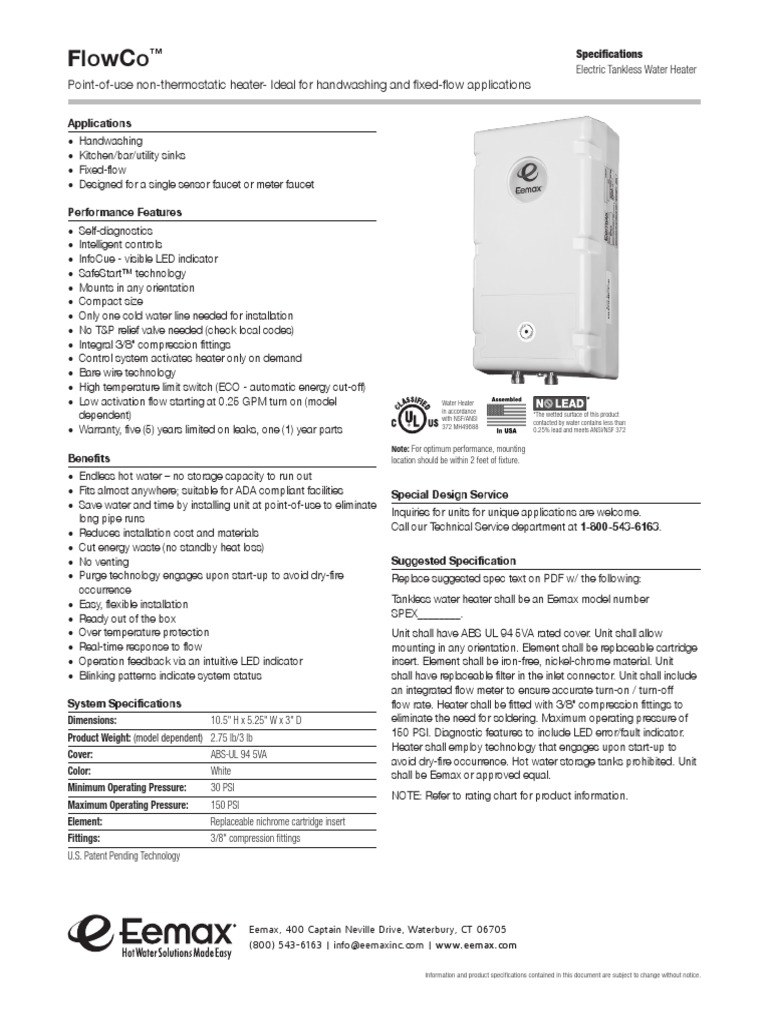 Water Heater EemaxSPEX4208ProductOverview PDF Water Heating