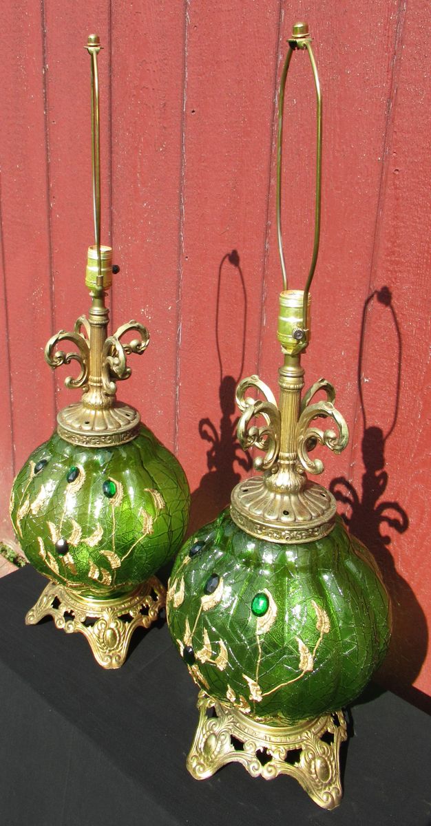C. 1970 EF & EF Industries Vintage Green Glass Lamp Set 1970s Retro Decor