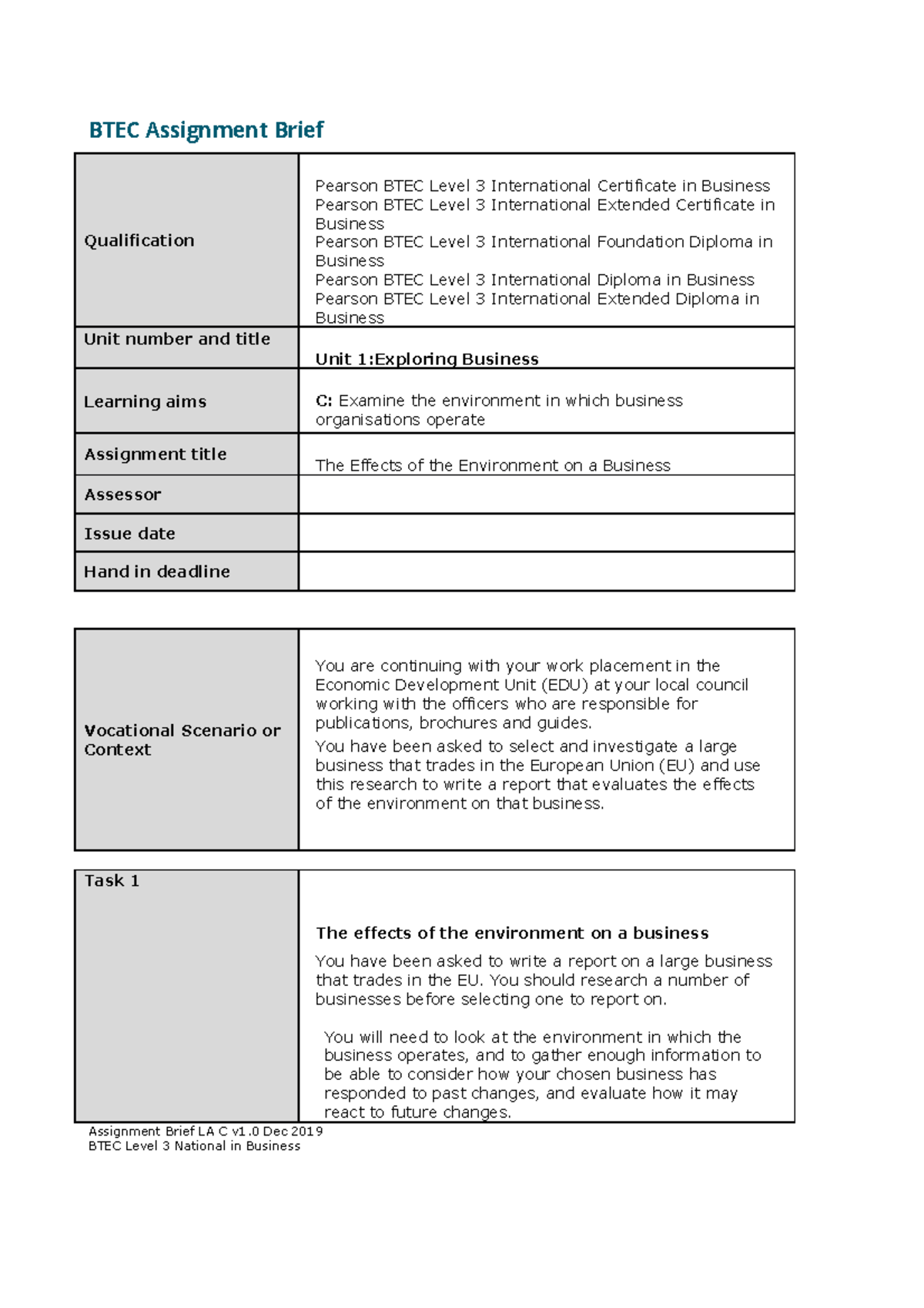 Unit 1 Exploring Business AAB Learning Aim C Version 1 Dec 2019 BTEC