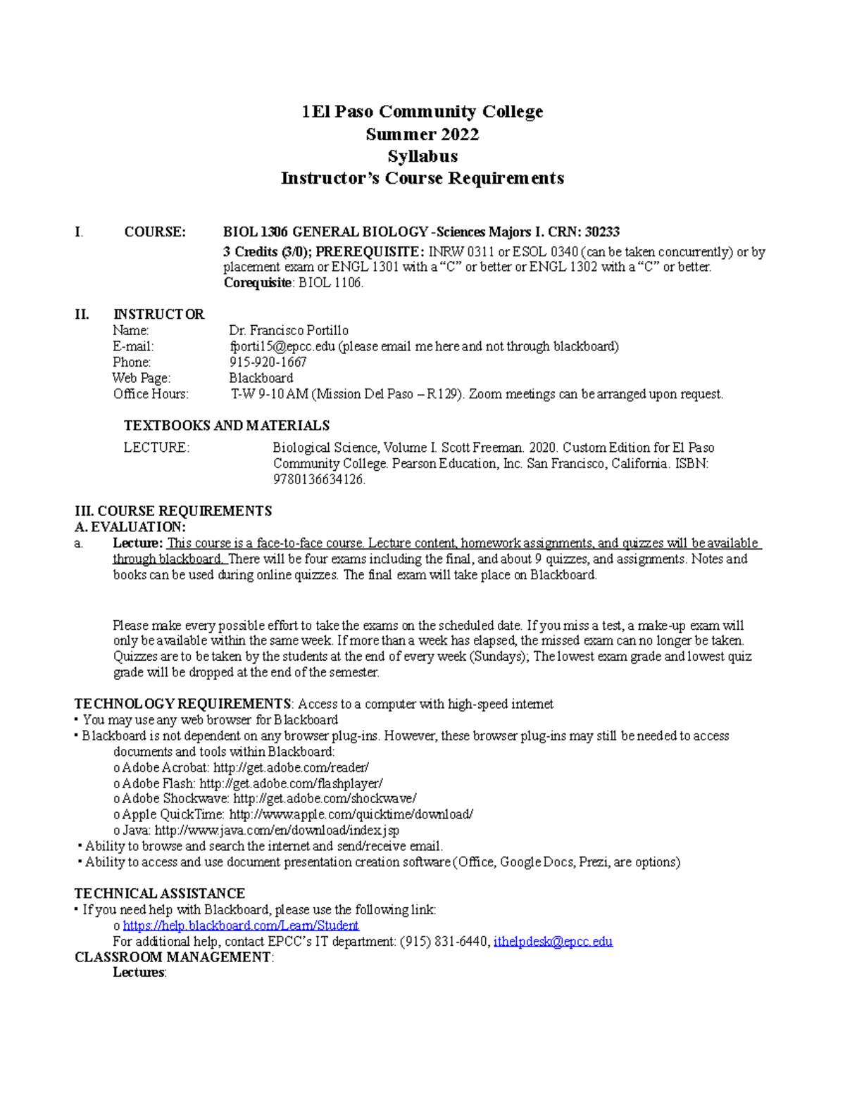 BIOL 1306 30233 Syllabus Summer 2022 Portillo(2) 1 El Paso Community