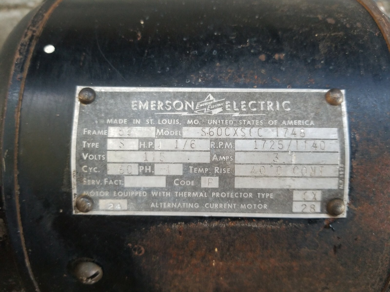 Vintage Emerson Electric AC Motor S44PS1013, HP 1/12, RPM 1725, PH. 1