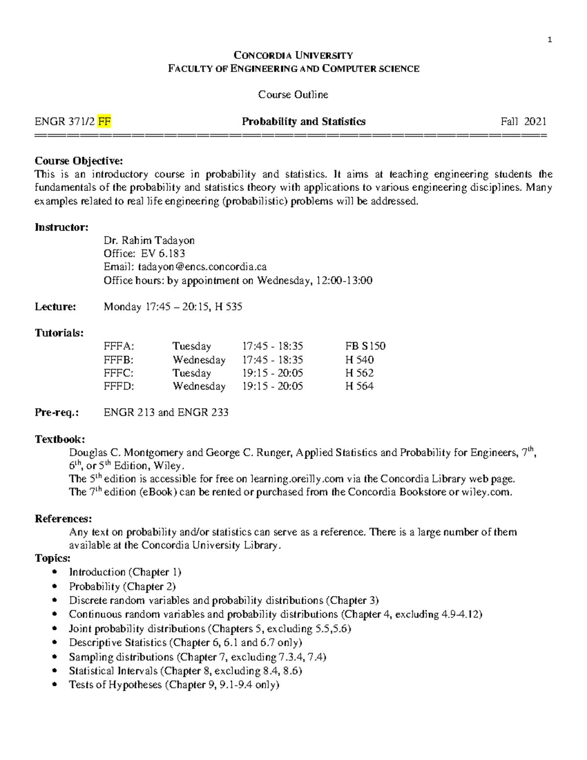 Course Outline ENGR 371 Fall 2021 FF ENGR 371 Concordia Studocu