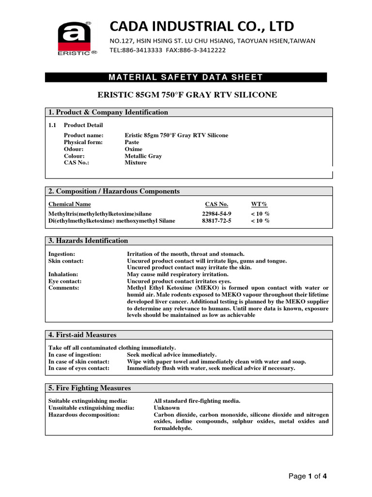 MSDS Eristic 85gm 750F Grey RTV Sealant PDF Materials Chemical