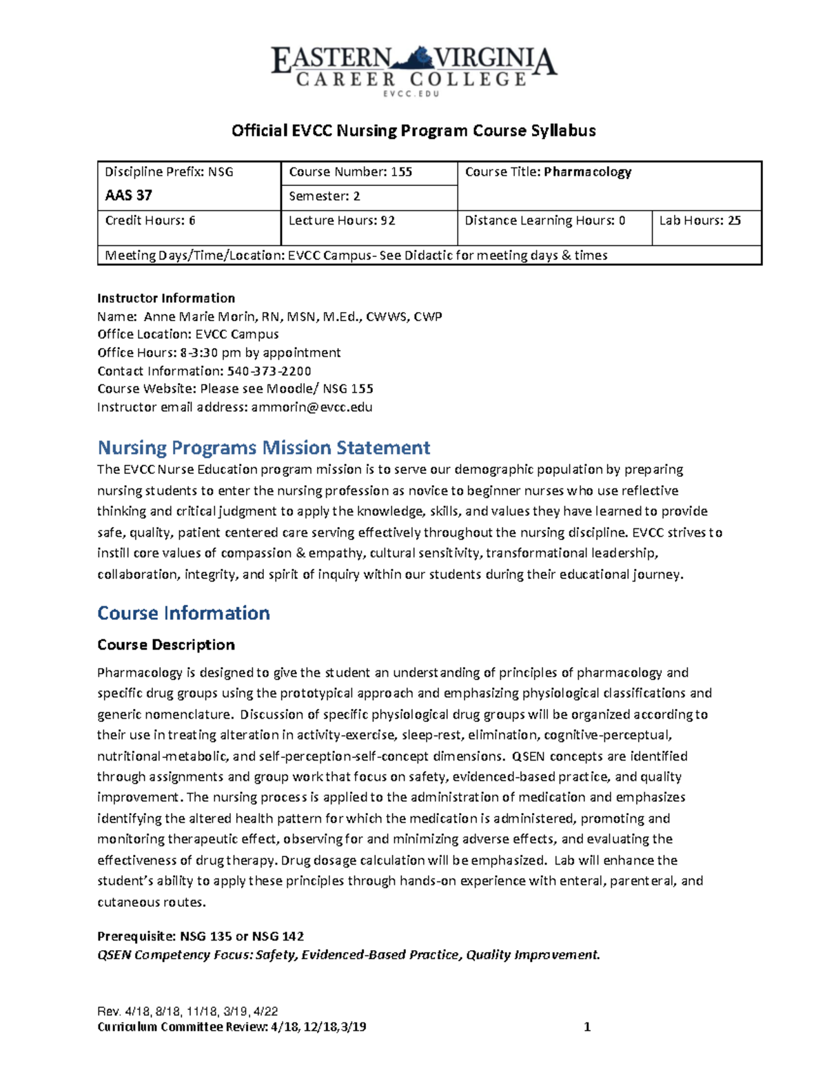 Syllabus NSG 155 Pharm Rev. 4/18, 8/18, 11/18, 3/19, 4/ Official EVCC
