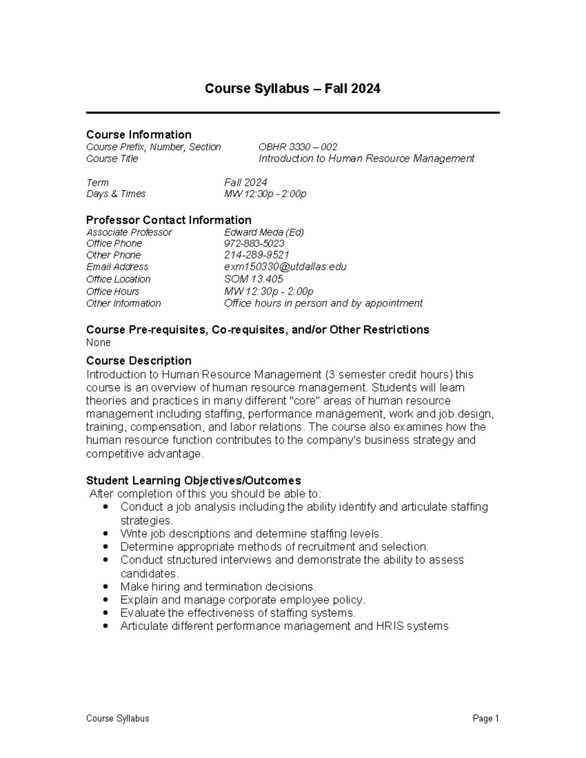 SyllabusOBHR 3330002 Fall 2024 Course Syllabus Fall 2024 Course