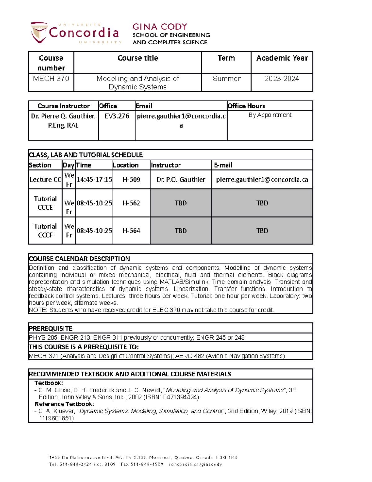 MECH 370 Course Outline Summer 2023 Course number Course title