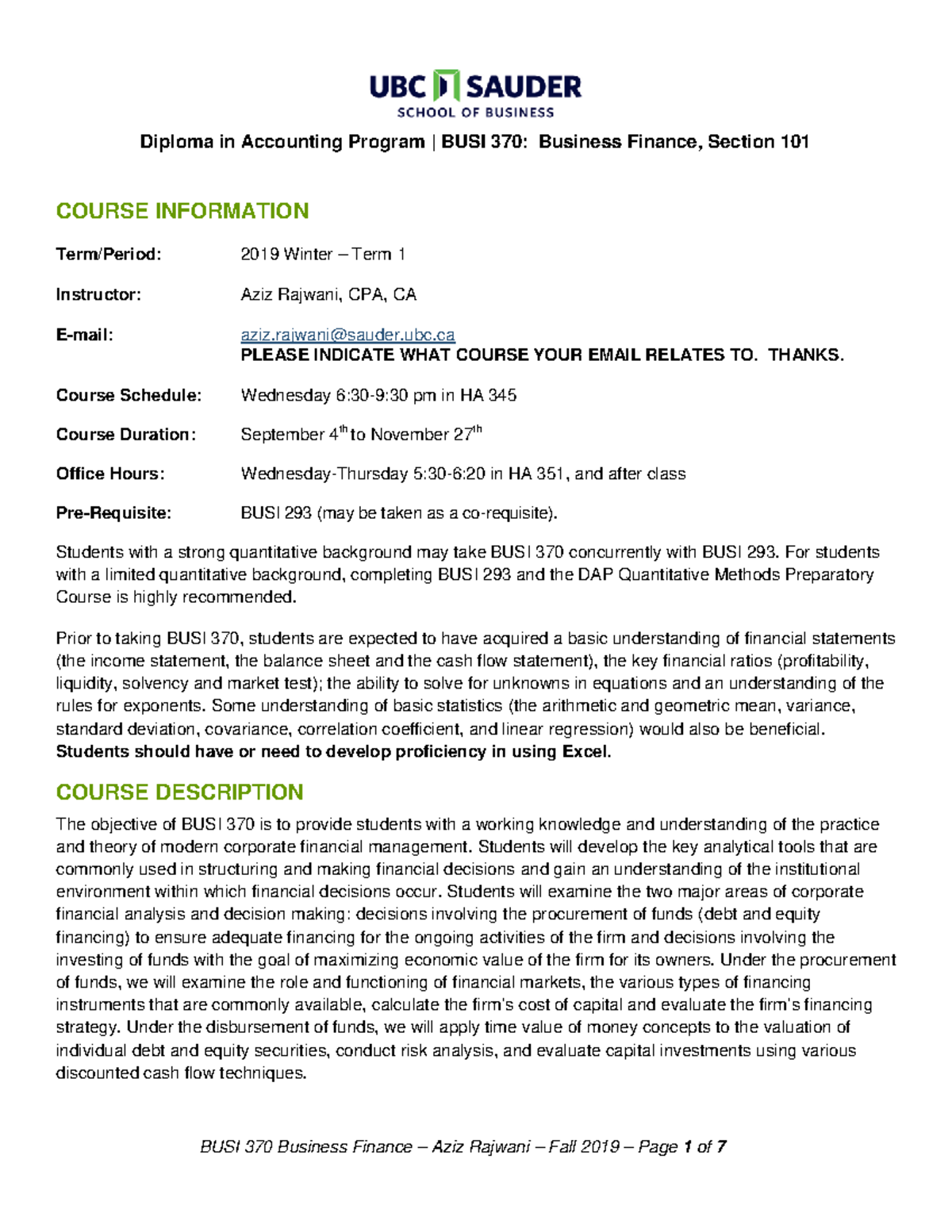 BUSI 370 Course outline COURSE INFORMATION Term/Period 2019 Winter