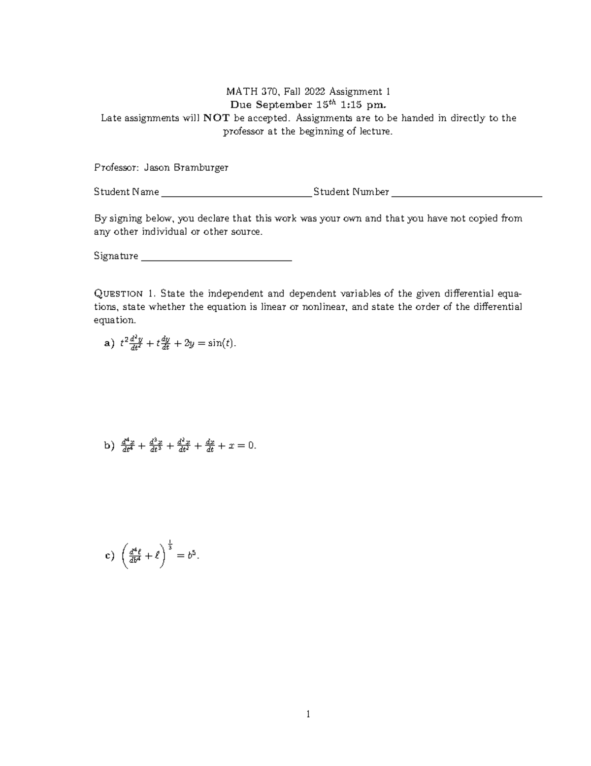 370 Assignment 1 ASS MATH 370, Fall 2022 Assignment 1 Due September