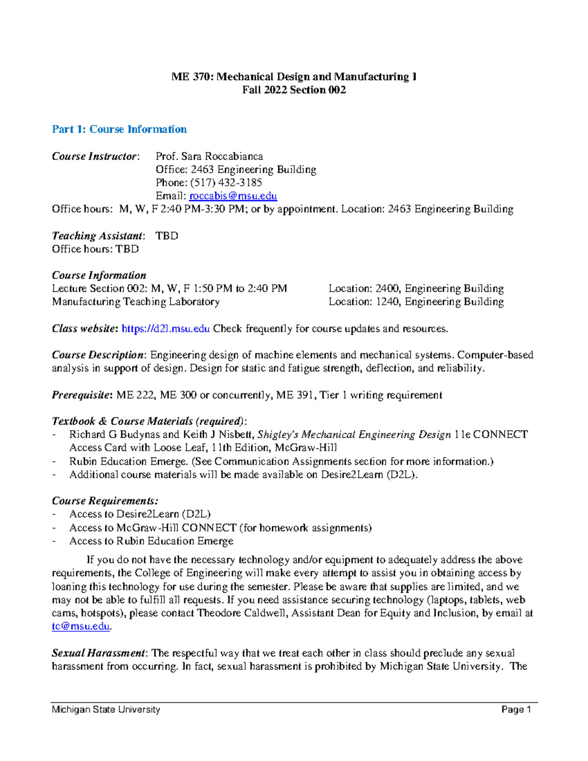 ME 370 FS22 Section 002 Syllabus ME 370 Mechanical Design and