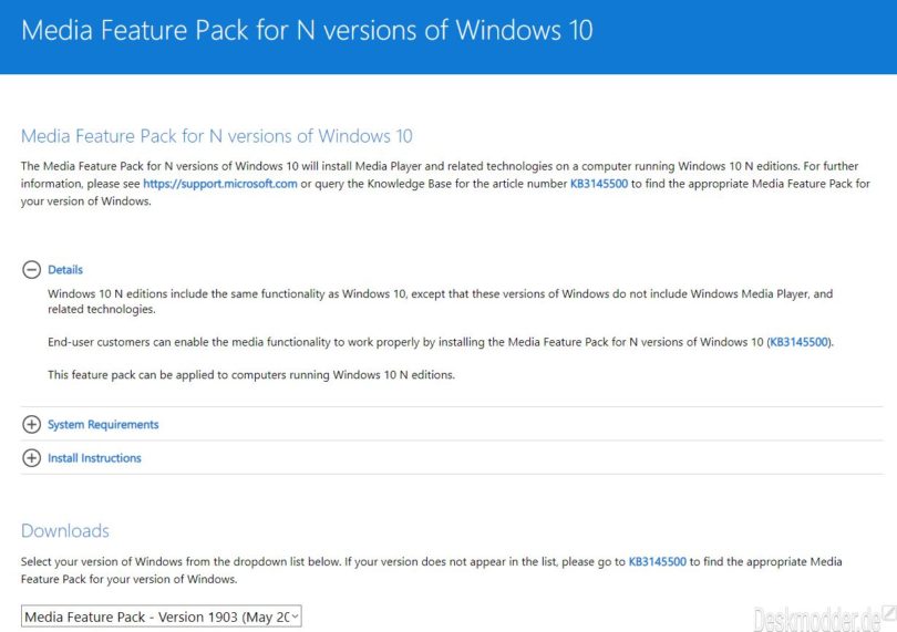 Media Feature Pack Windows 10 1903 steht zum Download bereit