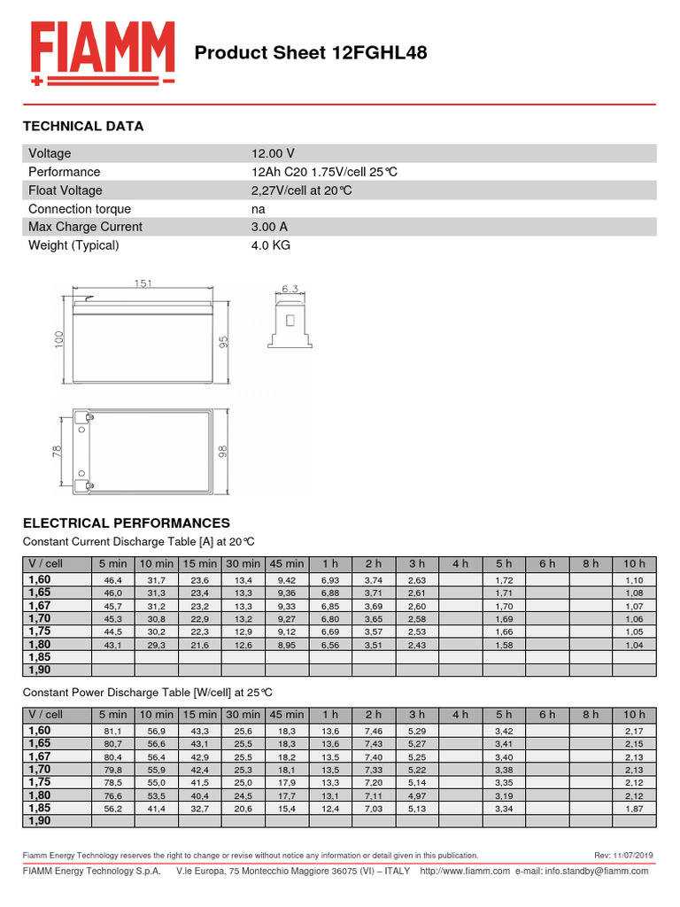 12v 12ah Fiamm Battery Data Sheet PDF Energy Storage Battery
