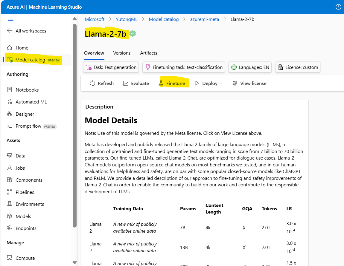 Fine tune model catalog Microsoft Q&A