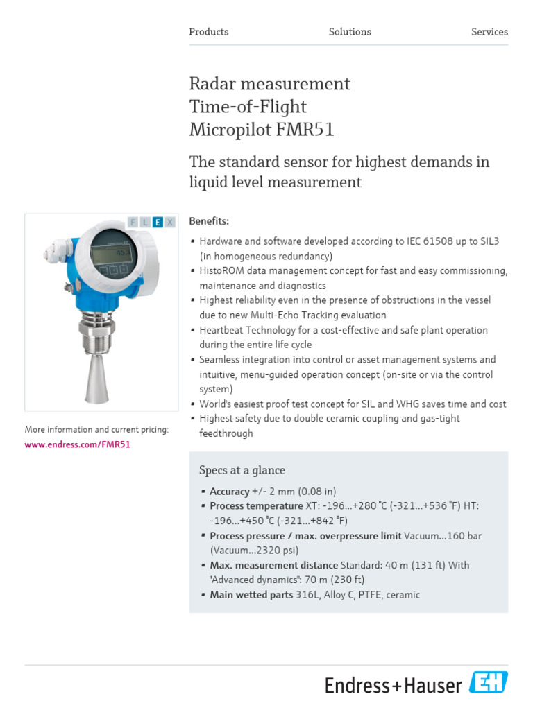 Endress+Hauser Radar Measurement TimeofFlight Micropilot Fmr51 Level