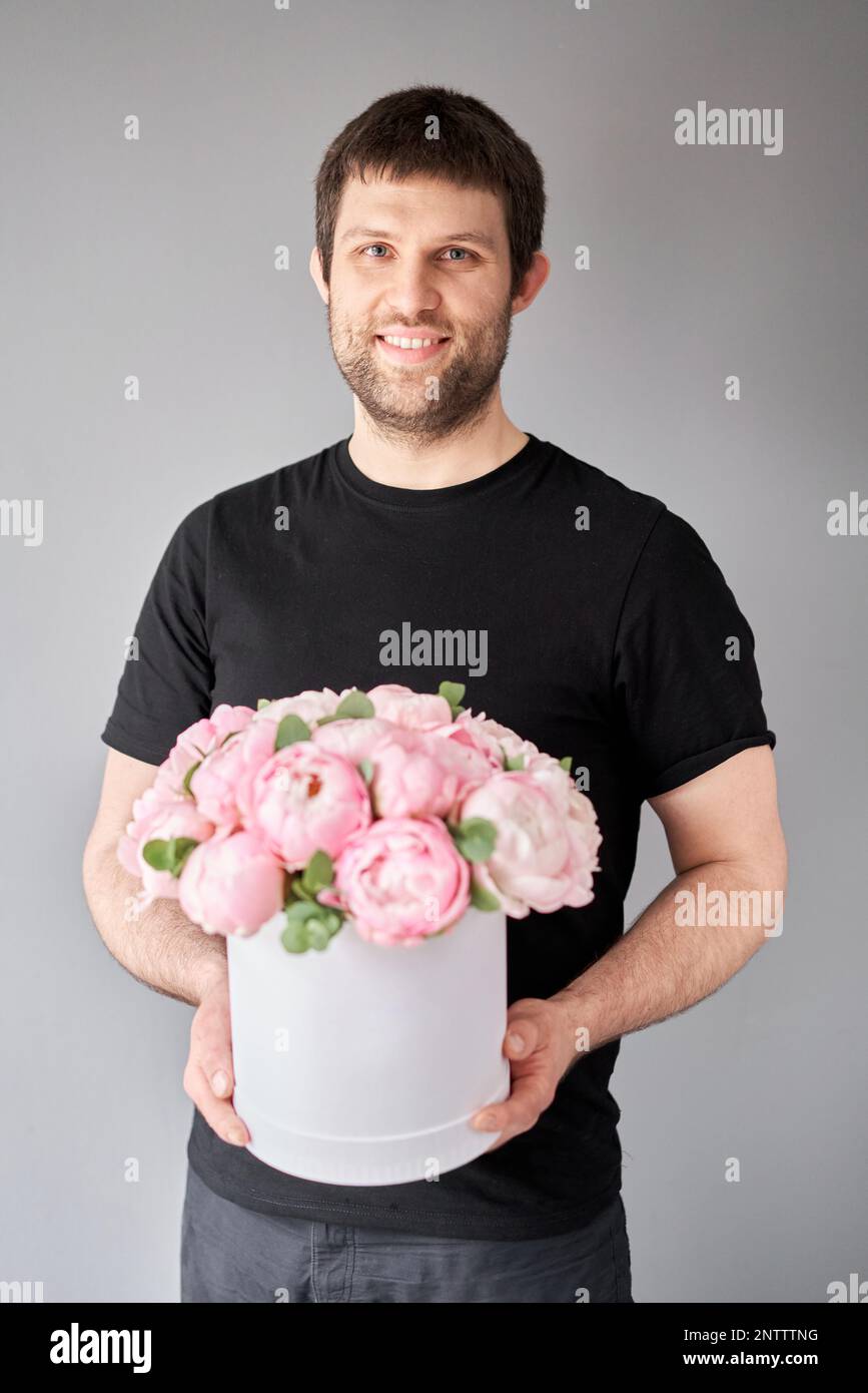 Round box with Pink Angel Cheeks peonies in a men hand. Beautiful peony
