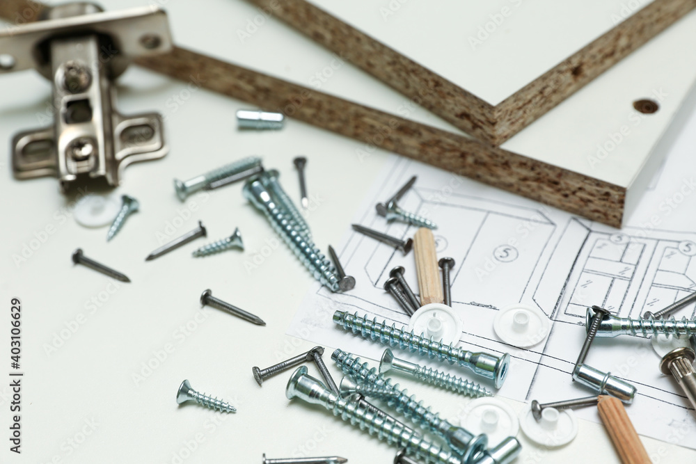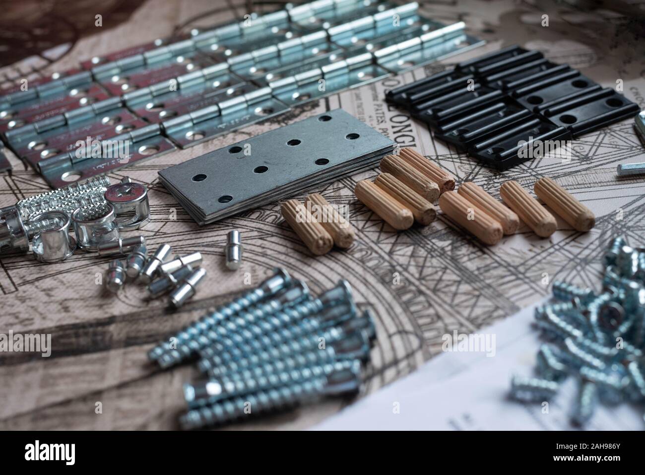 Spare Parts for Home Furniture Assembly Top View. Stock Photo Image