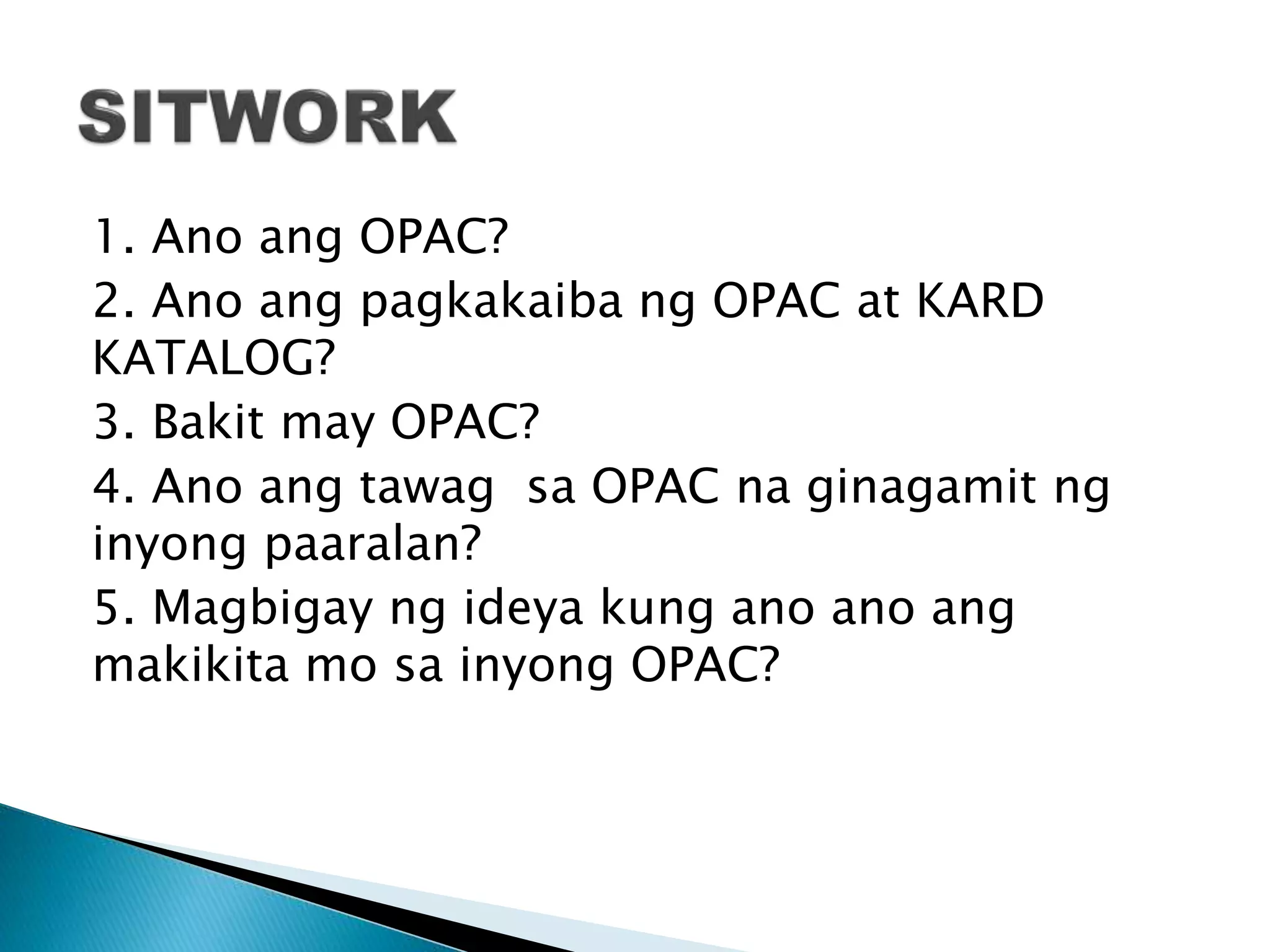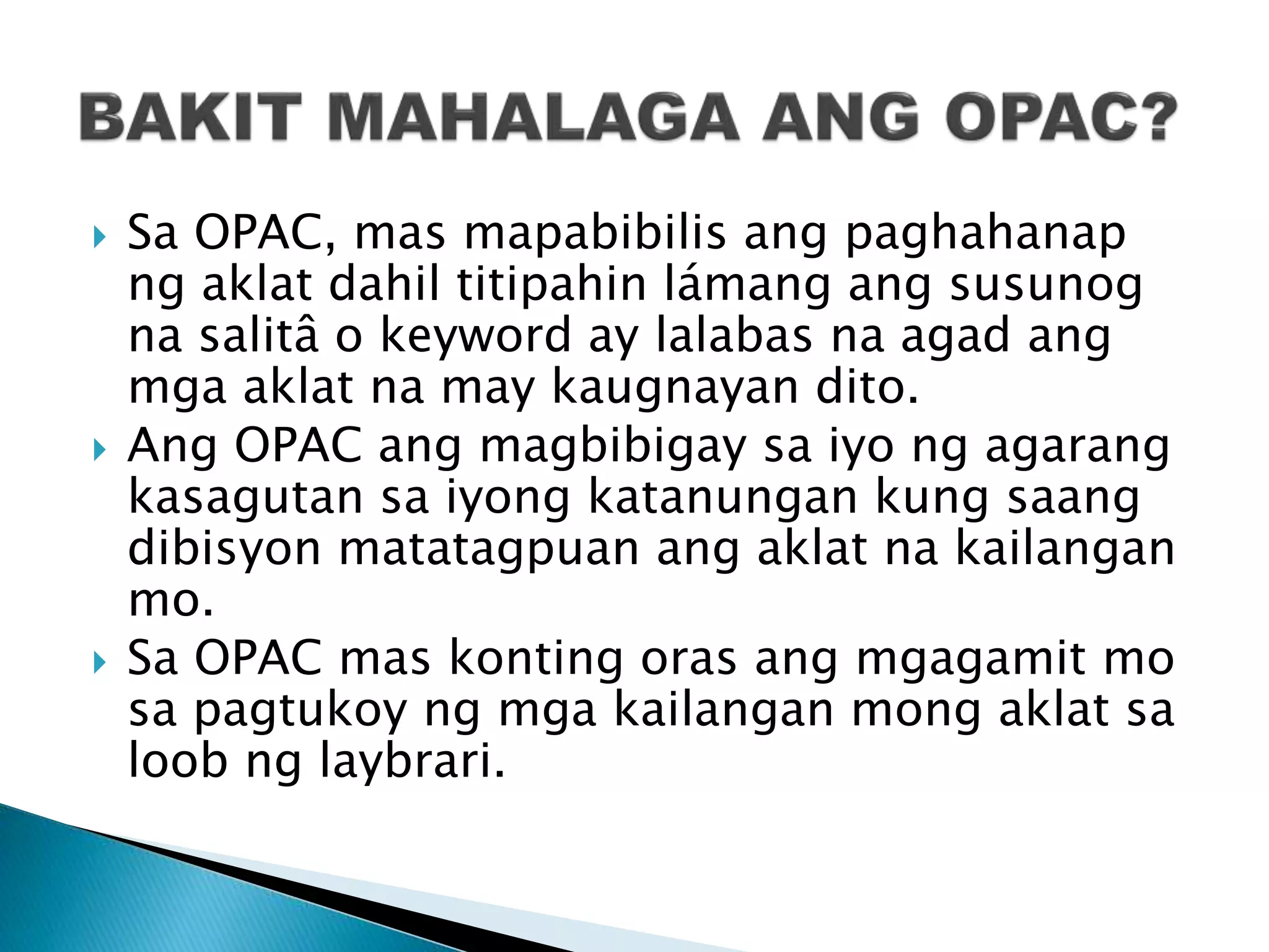 CARD CATALOG & ONLINE PUBLIC ACCESS CATALOG (OPAC) Report in FILIPINO