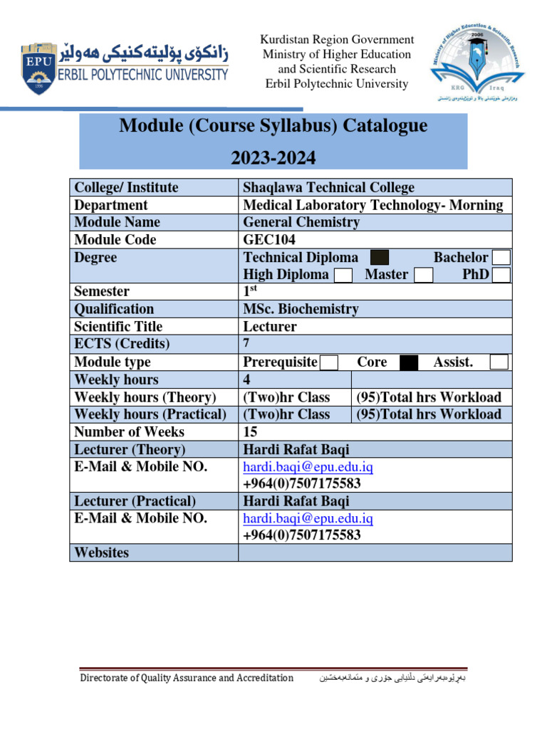 General Chemistry 101/102 Laboratory Manual Higher Education