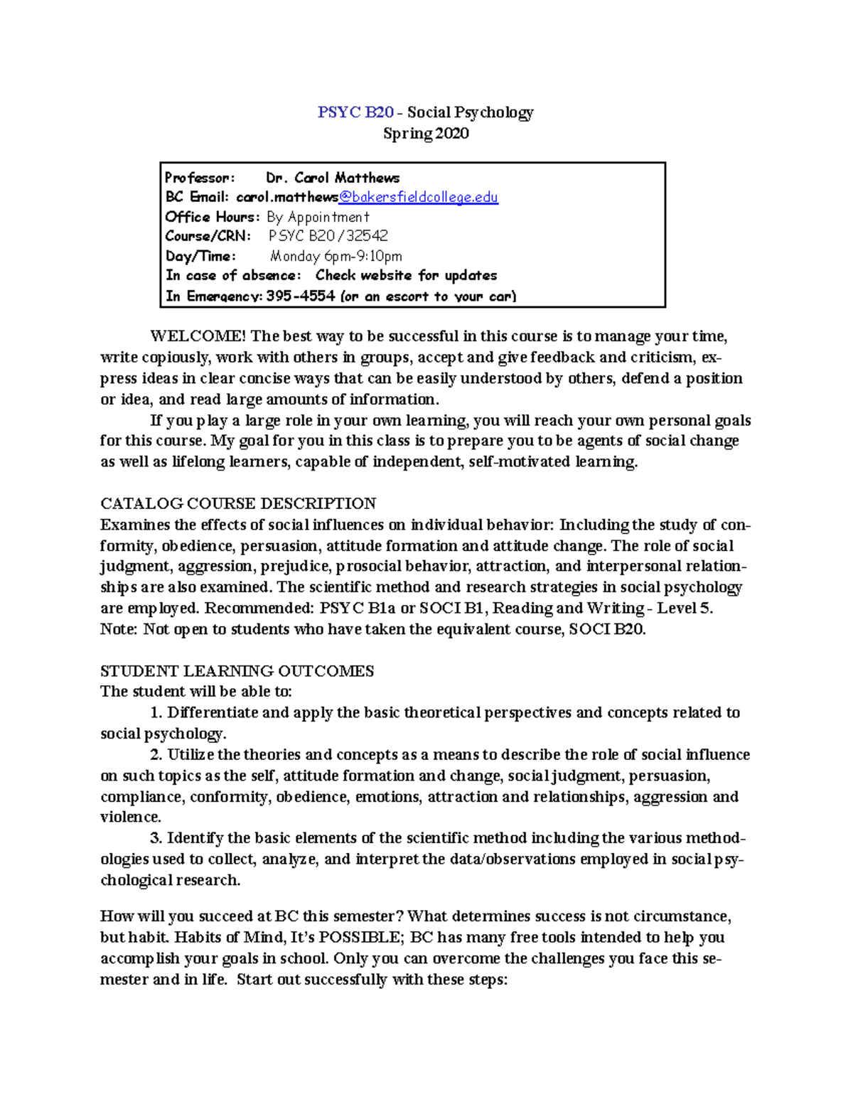 Social Psych Syllabus 2020 PSYC B20 Social Psychology Spring 2020