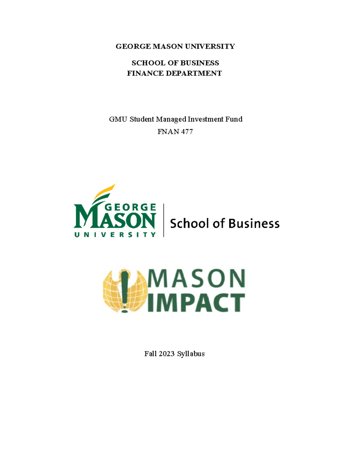 Fall 2023 Student Investment Fund Syllabus MASON UNIVERSITY