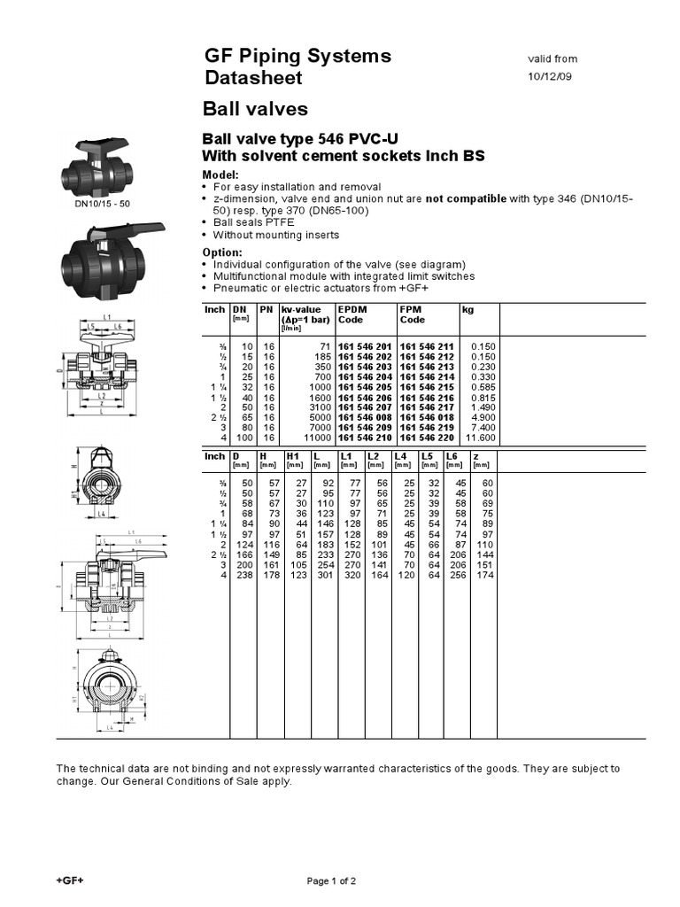 GF Piping Systems Datasheet Ball Valve Type 546 PVCU With Solvent