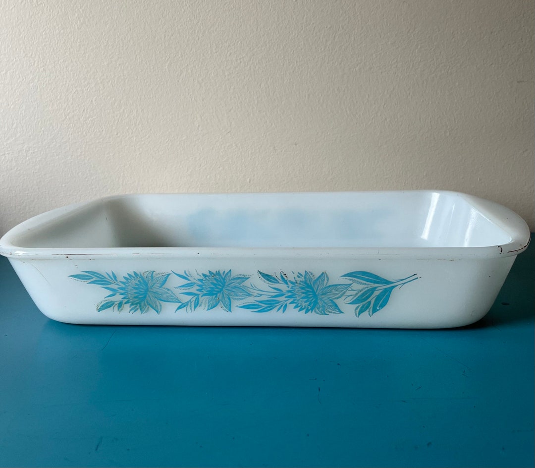 Vintage Glasbake 263 Lasagna Pan Blue Thistle Milk Glass Casserole Dish