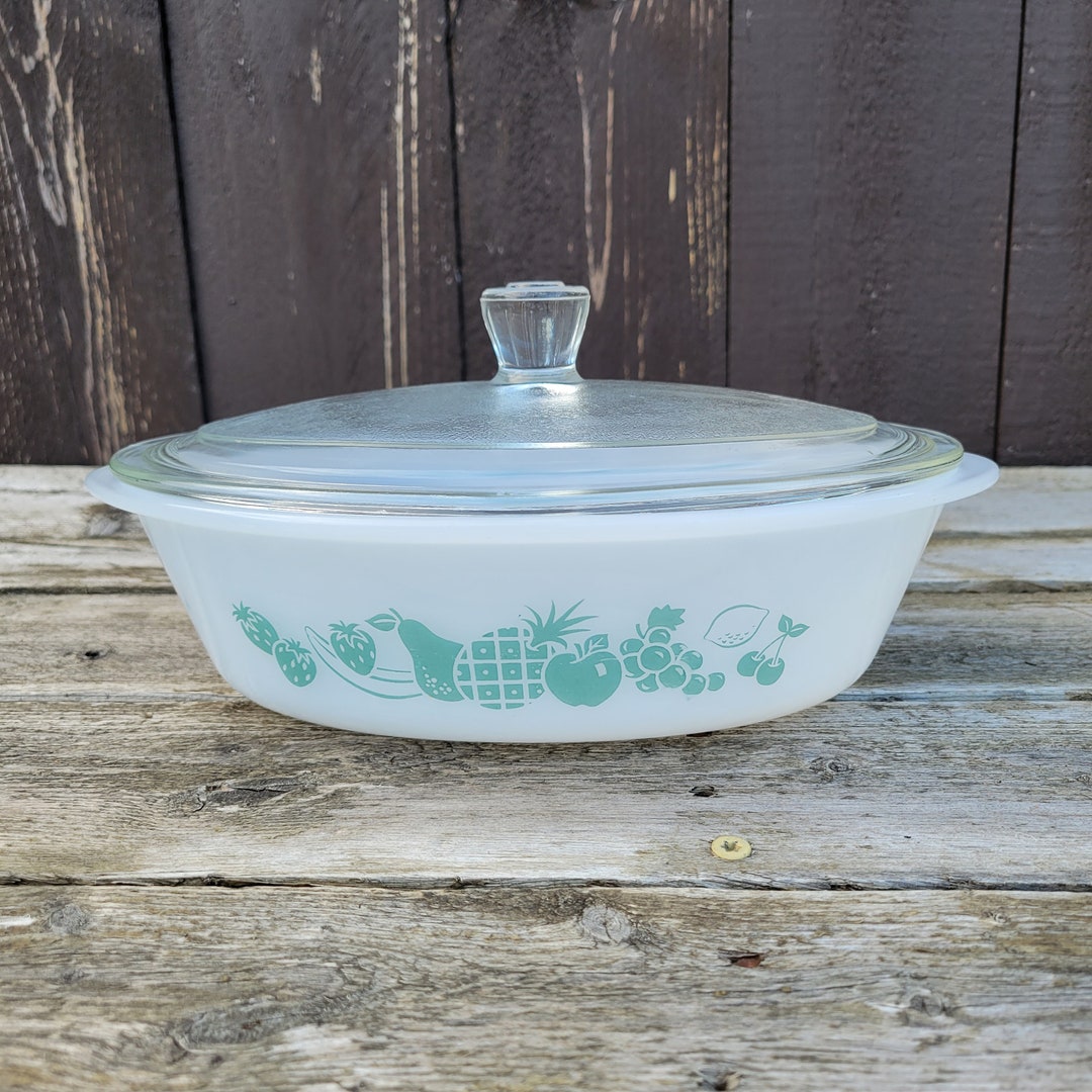 Vintage Glasbake Turquoise Fruit Oval Casserole Dish With Lid, Pattern