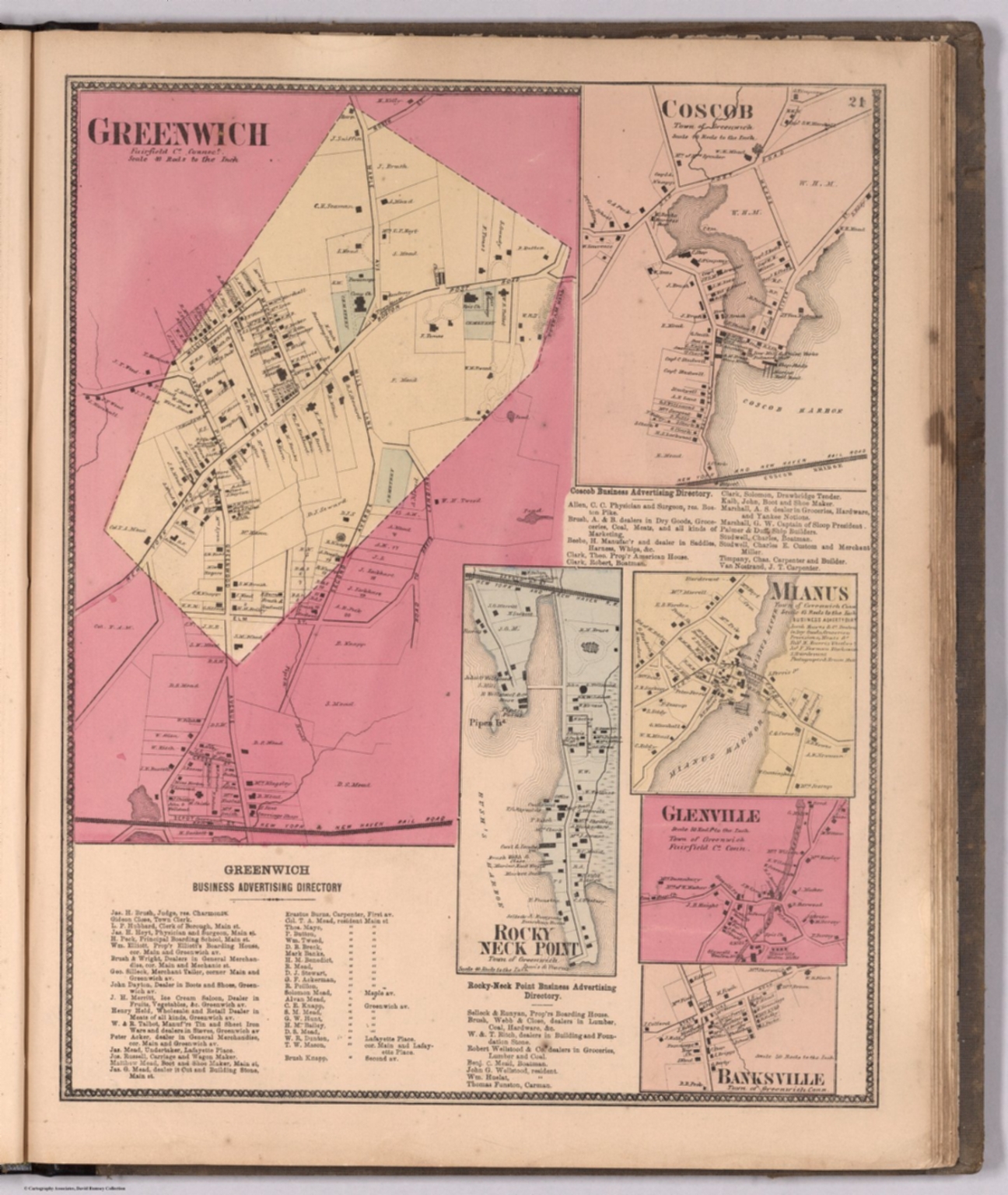 Greenwich. Coscob. Rocky Net Point. Mianus. Glenville. Banksville
