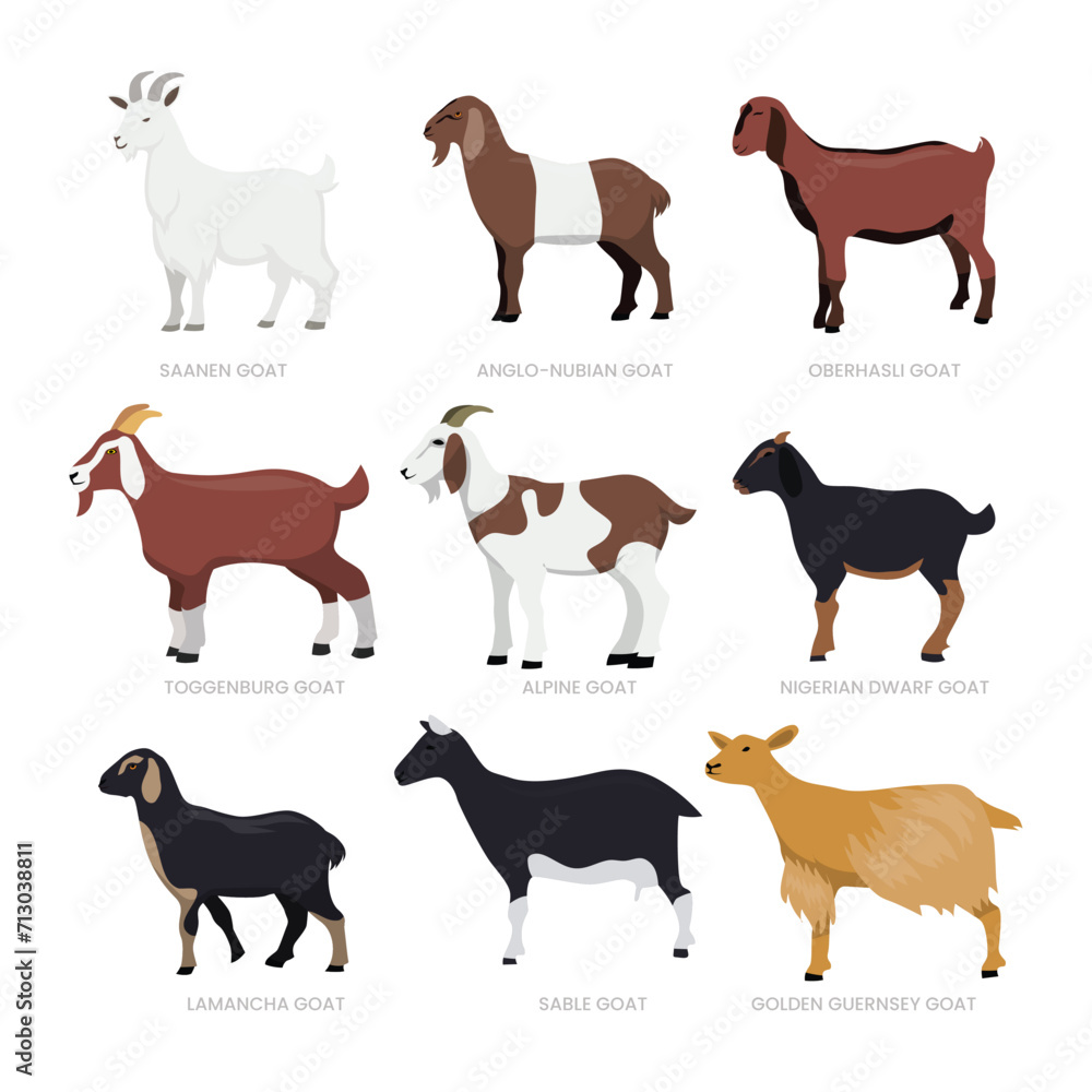 Different types of goat set collection, breeds of domestic goat cartoon