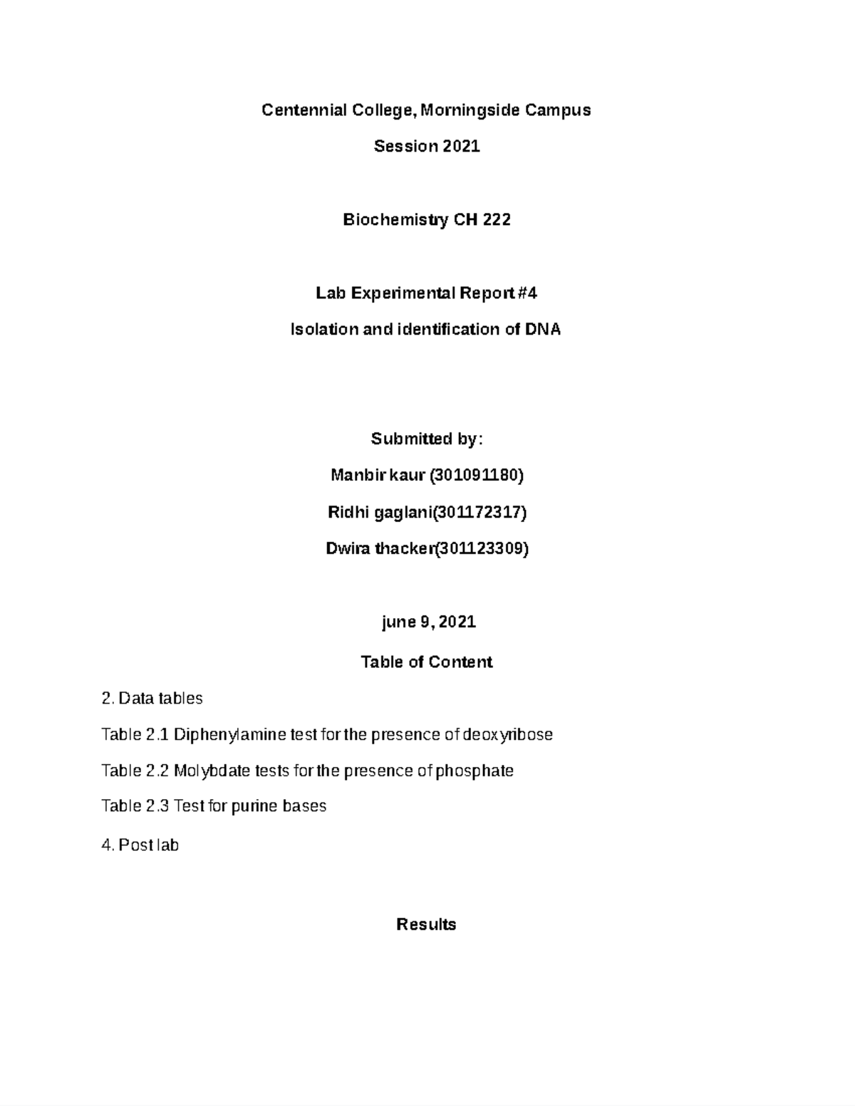 Biochem post lab 4 Google Docs Centennial College, Morningside