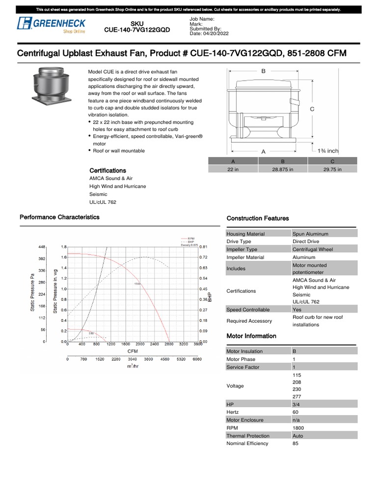 GREENHECK CUE140A Submittal PDF Decibel Horsepower