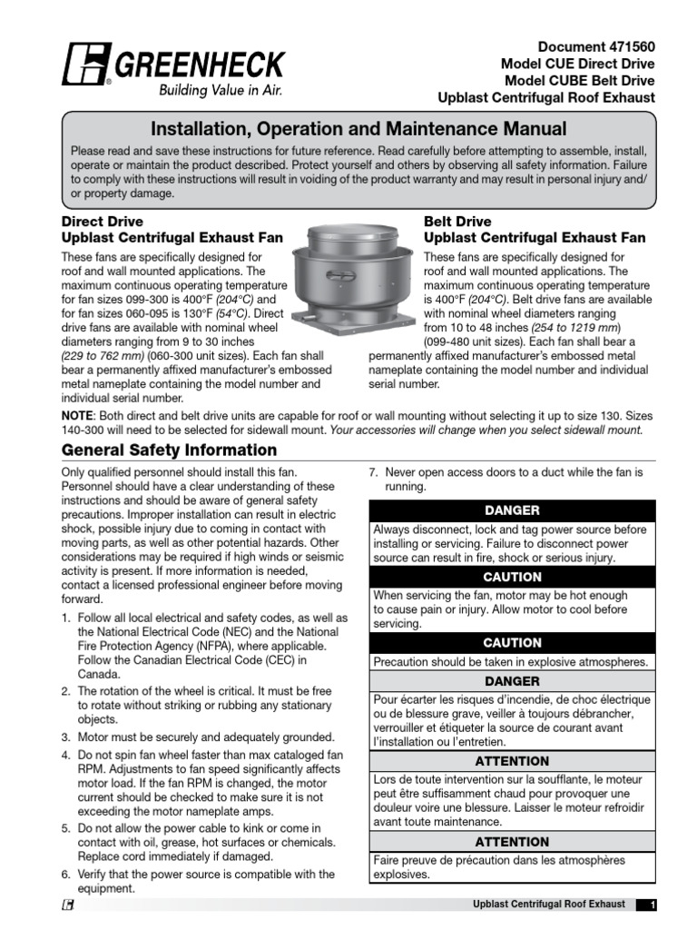 GREENHECK CUE INSTALLATION, OPERATION AND MAINTENANCE MANUAL Pdf