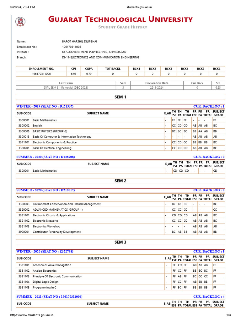 GTU Marksheet PDF Electronics Electrical Engineering