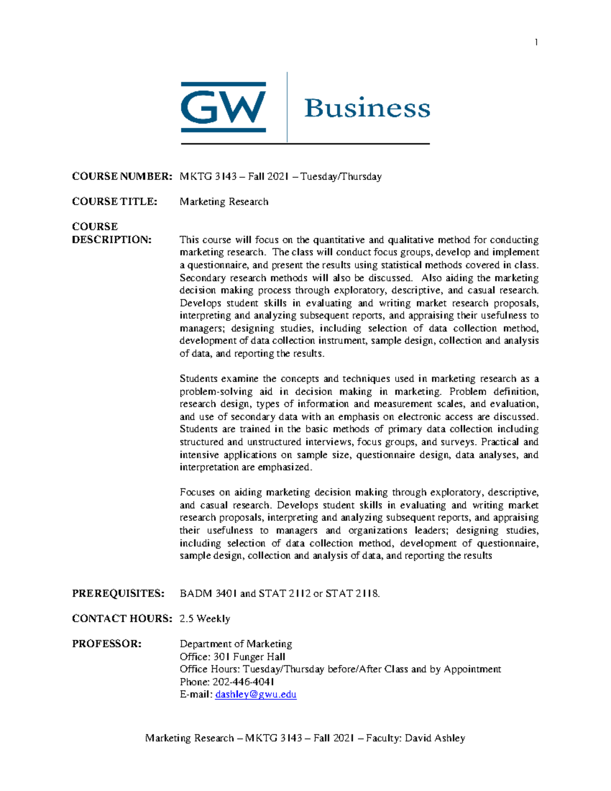 GWU Marketing Research MKTG3143 Syllabus Fall 2021 1 COURSE NUMBER