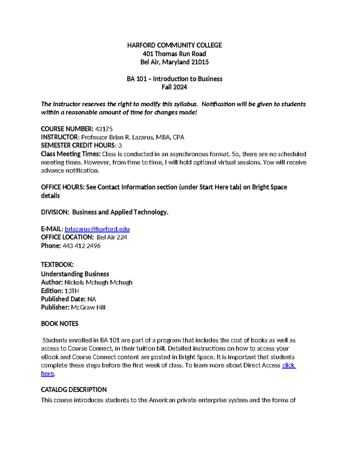 BA 101 Syllabus Fall 2024 43175 HARFORD COMMUNITY COLLEGE 401