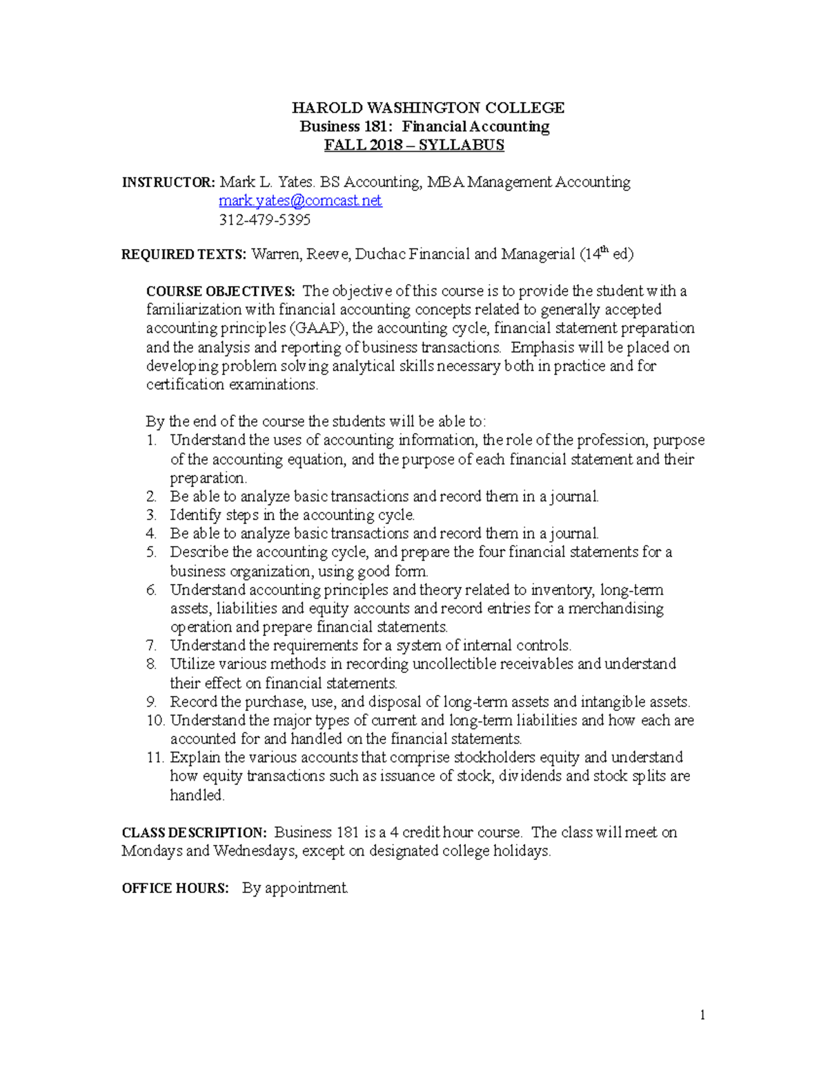 Business 181 Syllabus Fall 2018 Monday and Wednesday HAROLD