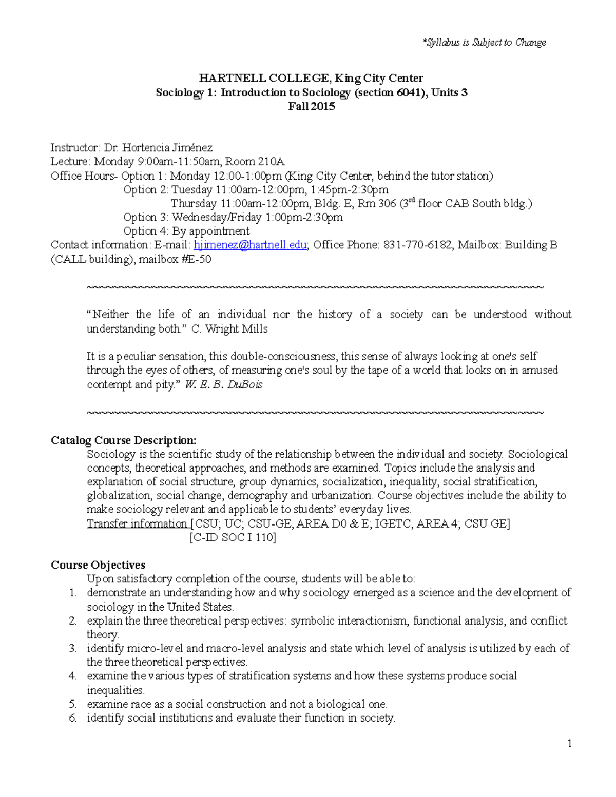 SOC 1 Fall2015 syllabus HARTNELL COLLEGE, King City Center Sociology