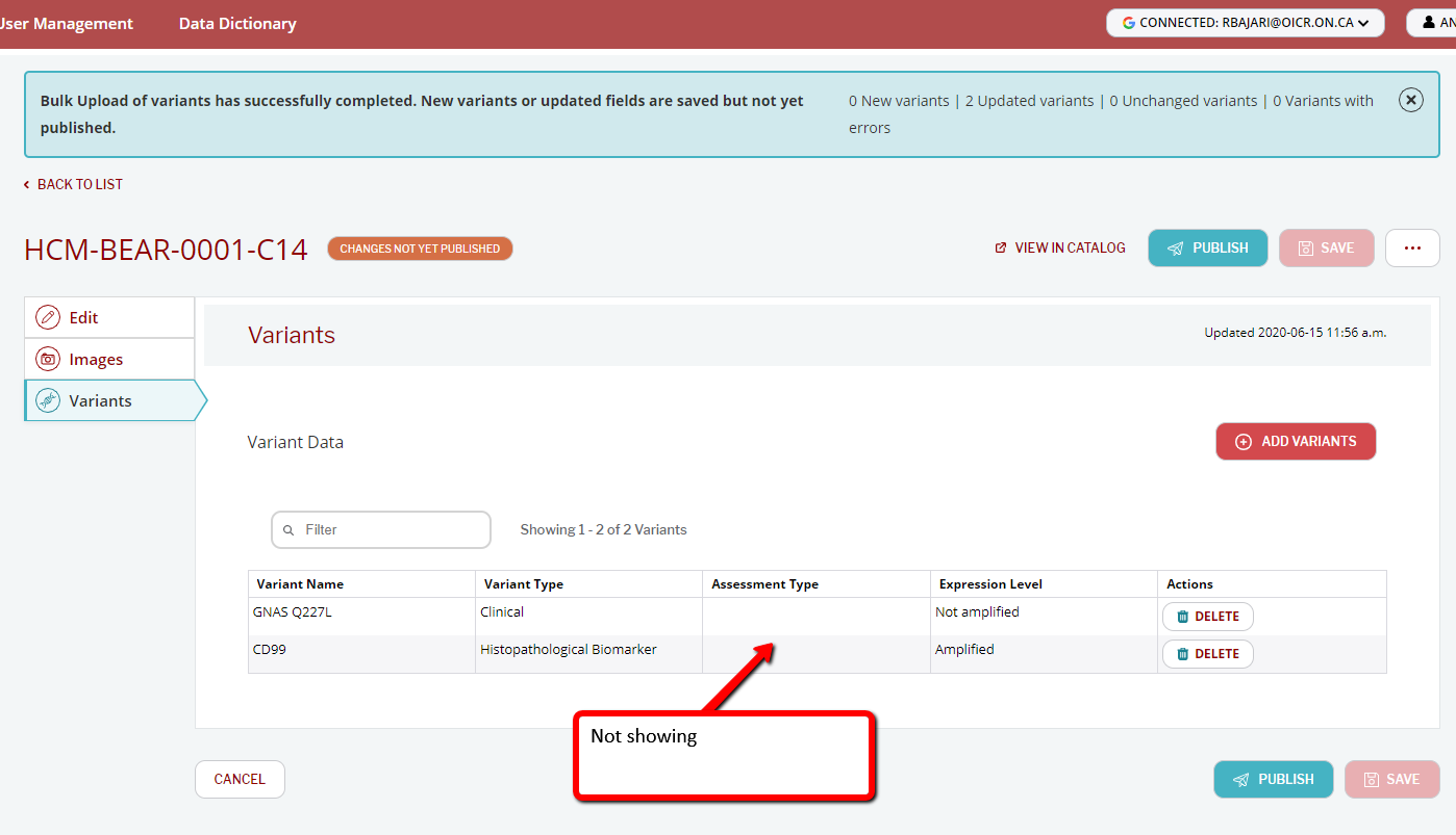 Bug Upload variant assessment type not coming through · Issue 641