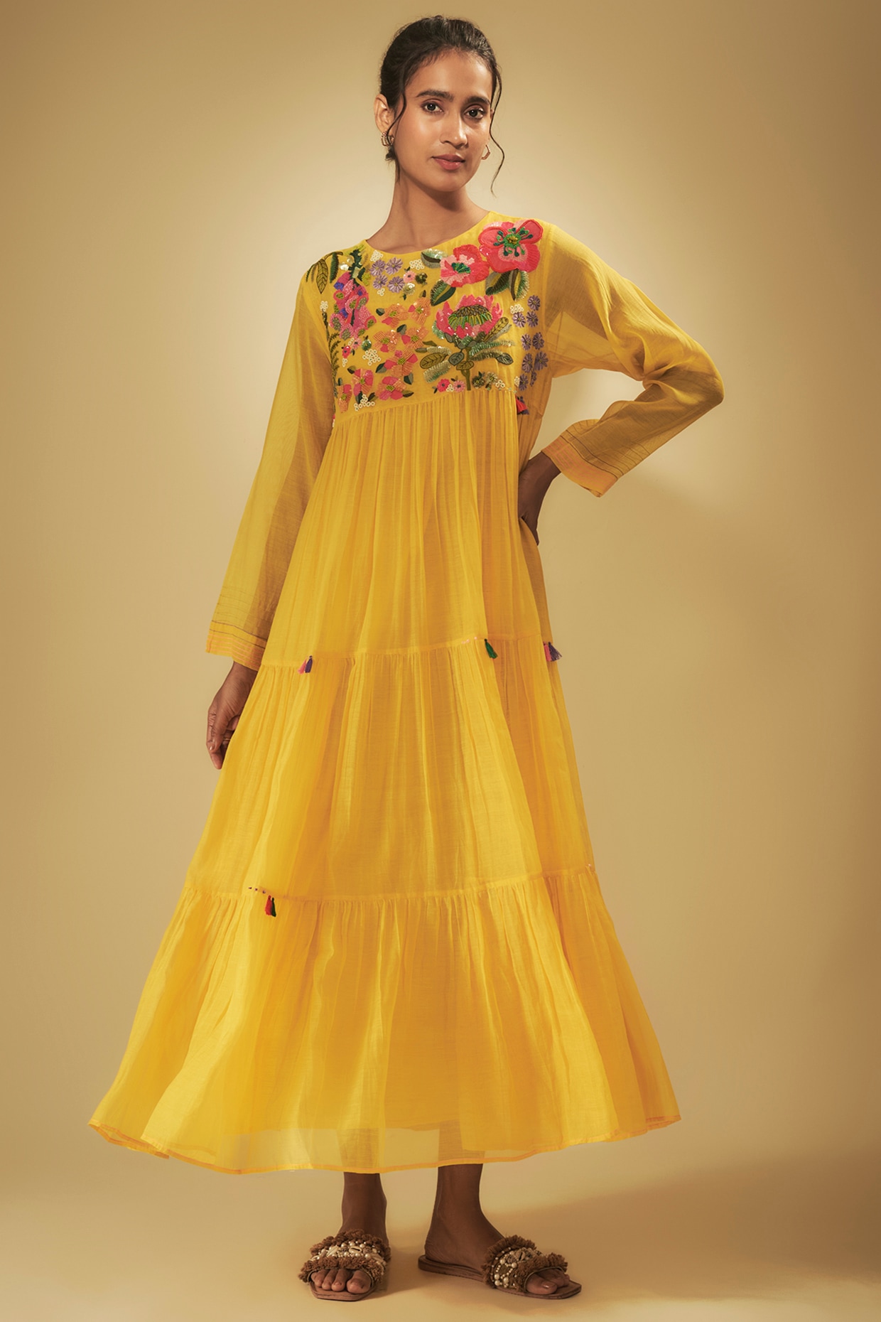 Yellow Fine Chanderi Embroidered Tiered Maxi Dress by Half Full Curve