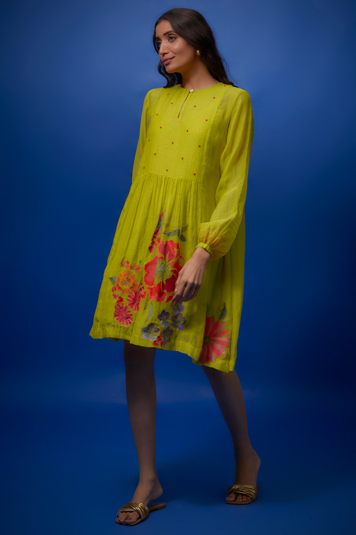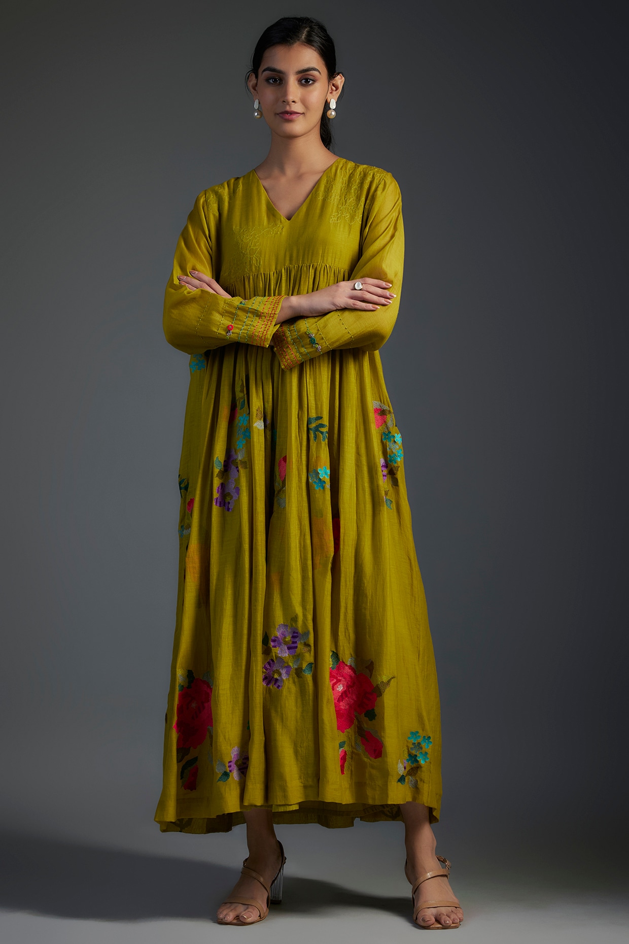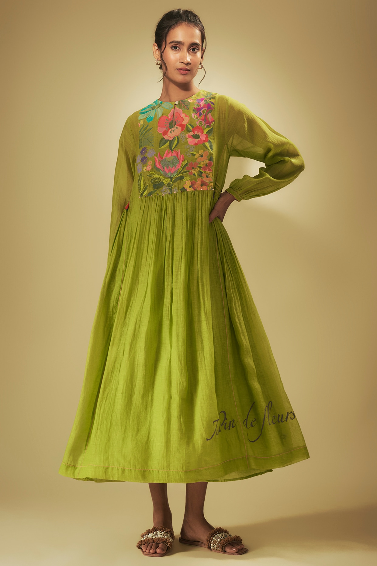 Green Fine Chanderi Hand & Machine Embroidered Gathered Dress by Half