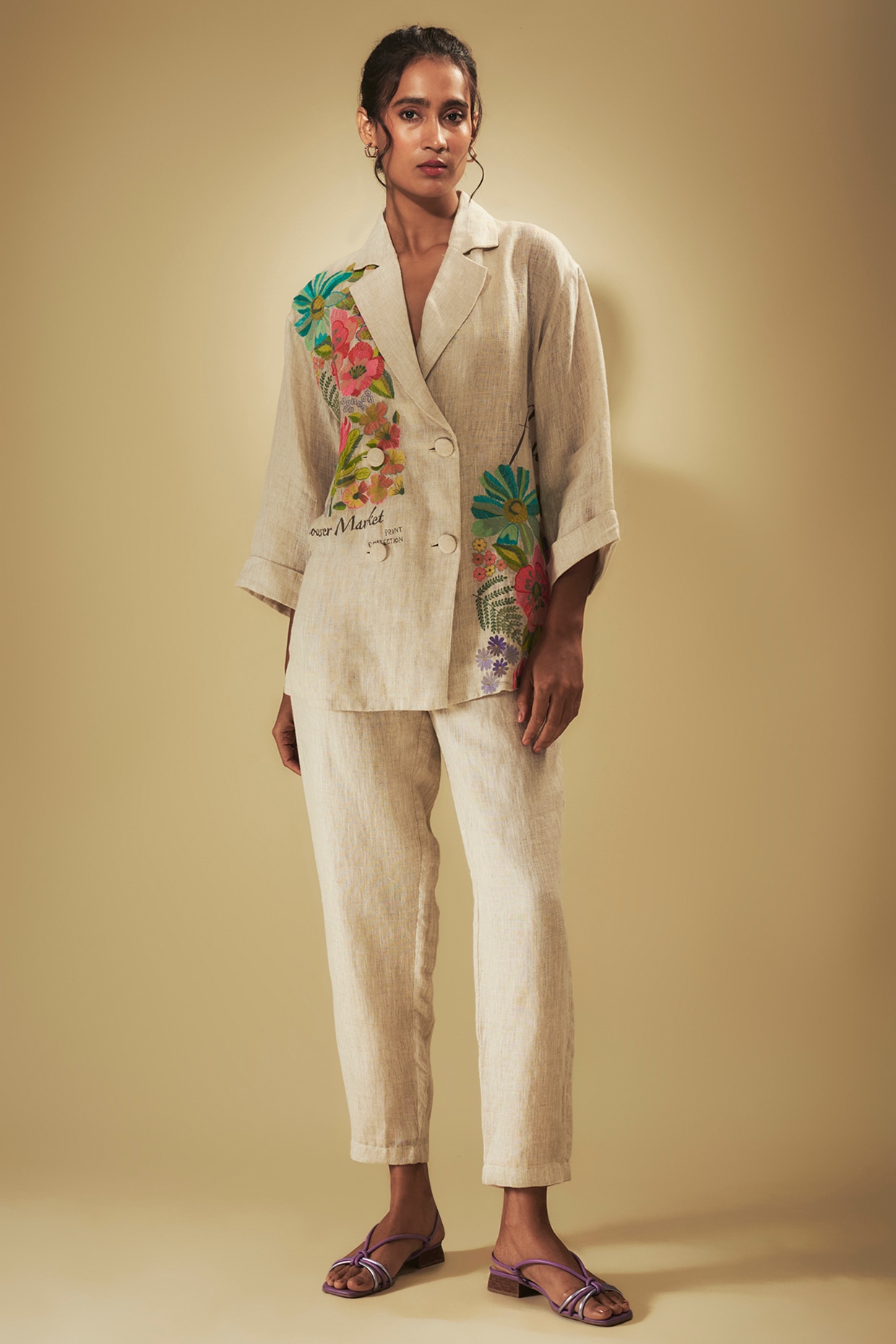 Ivory Pure Linen Hand Embroidered Blazer Set by Half Full Curve at