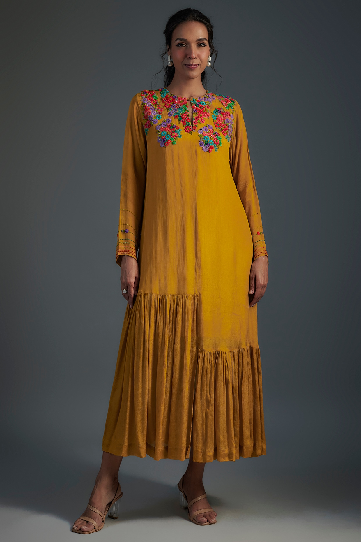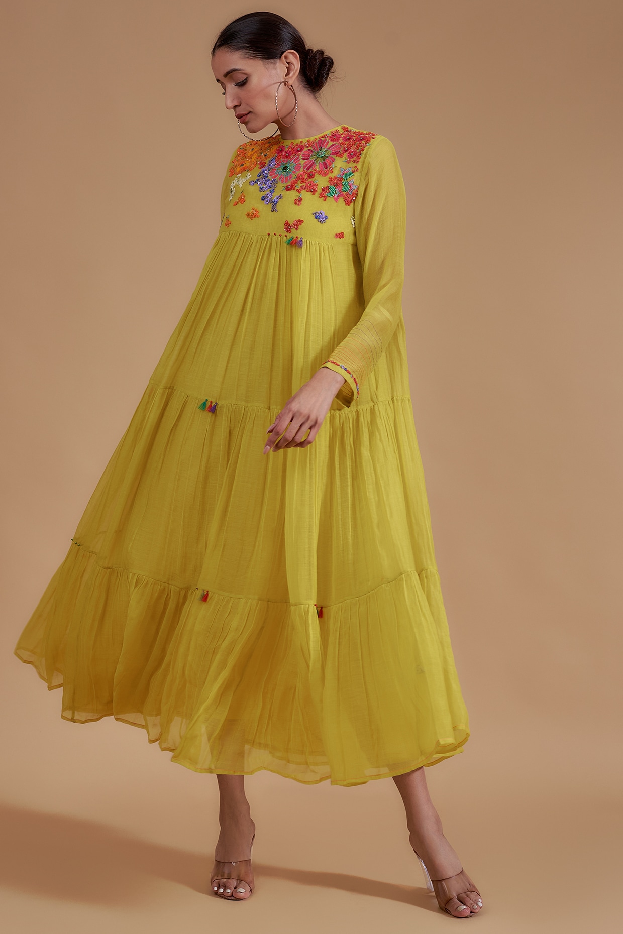 Yellow Fine Chanderi Hand Embroidered Dress by Half Full Curve at