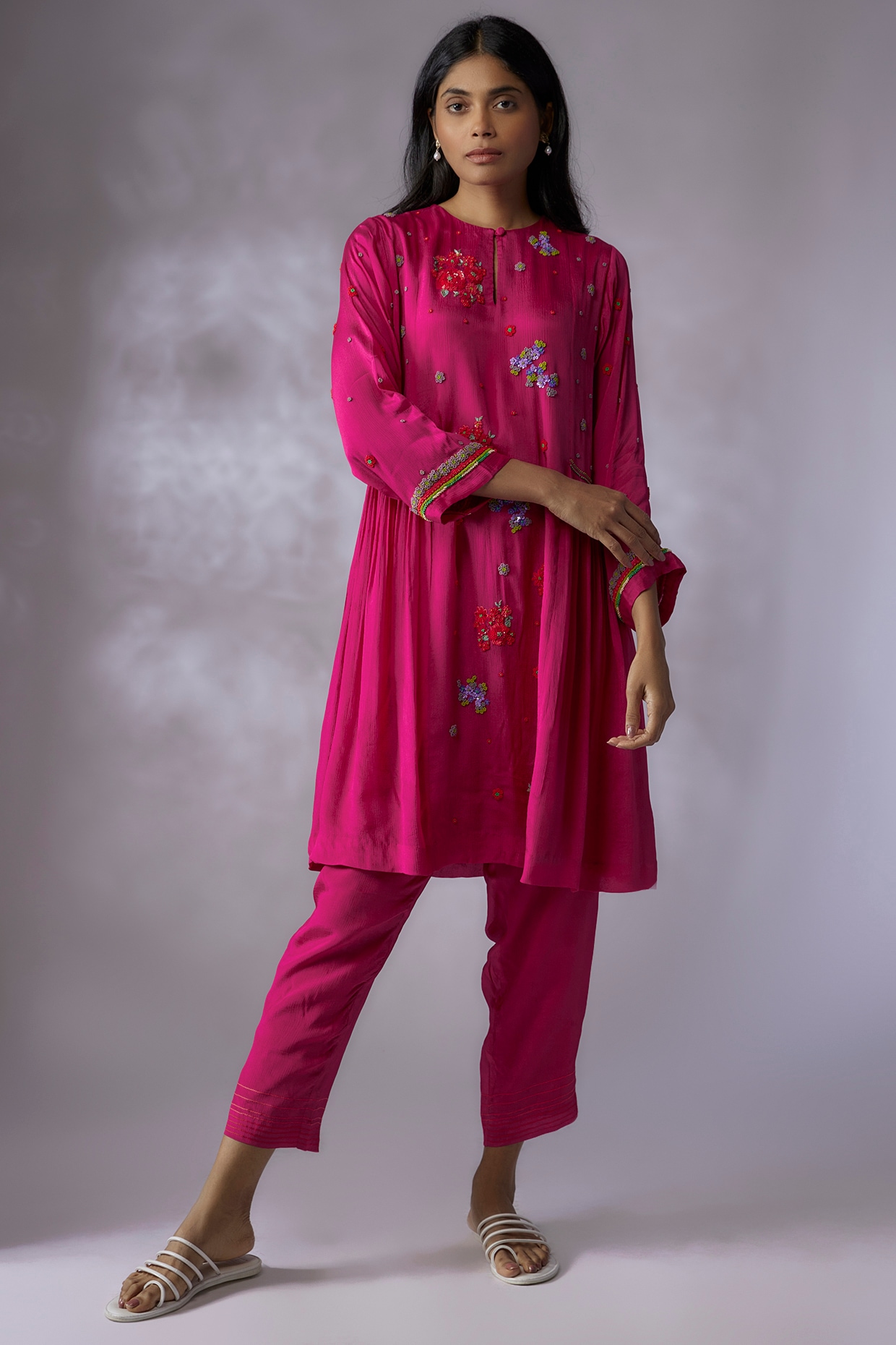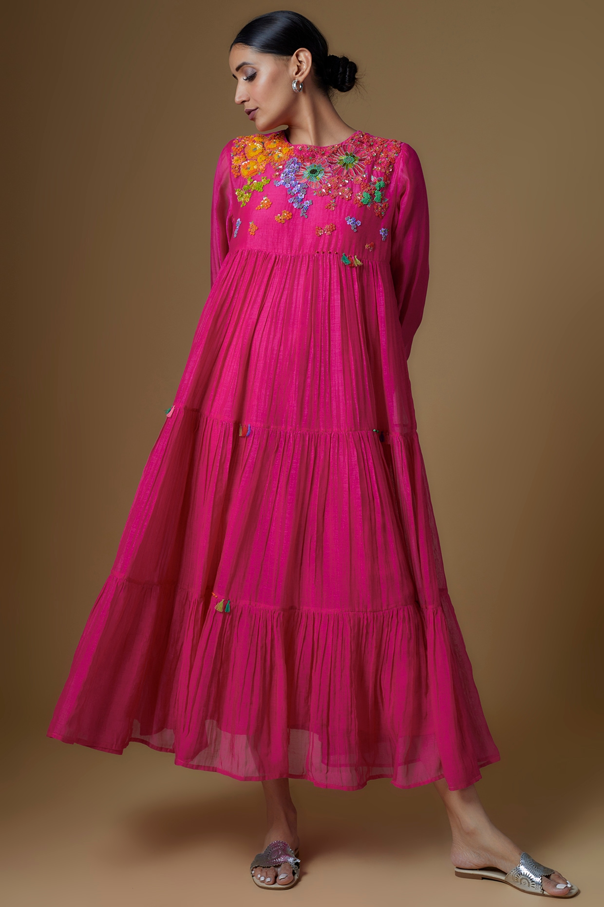 Pink Chanderi Hand Embroidered Dress by Half Full Curve at Pernia's Pop