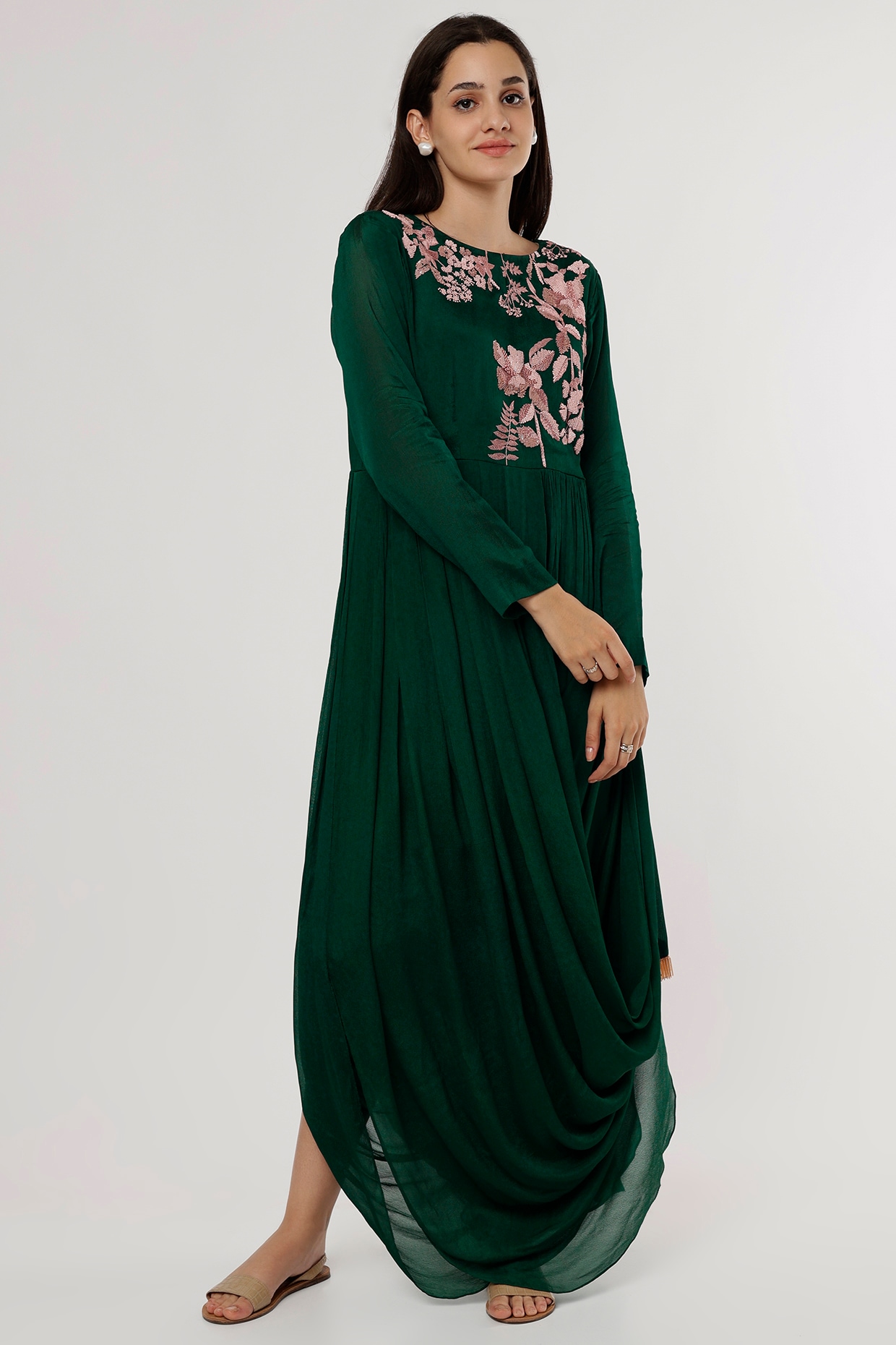 Emerald Green Hand Embroidered Drape Dress by Half Full Curve at Pernia
