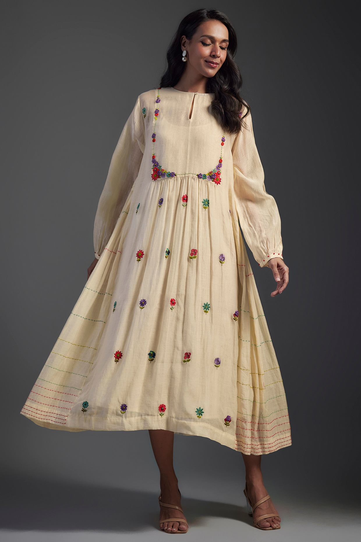 Ivory Fine Chanderi Hand Embroidered Midi Dress by Half Full Curve at