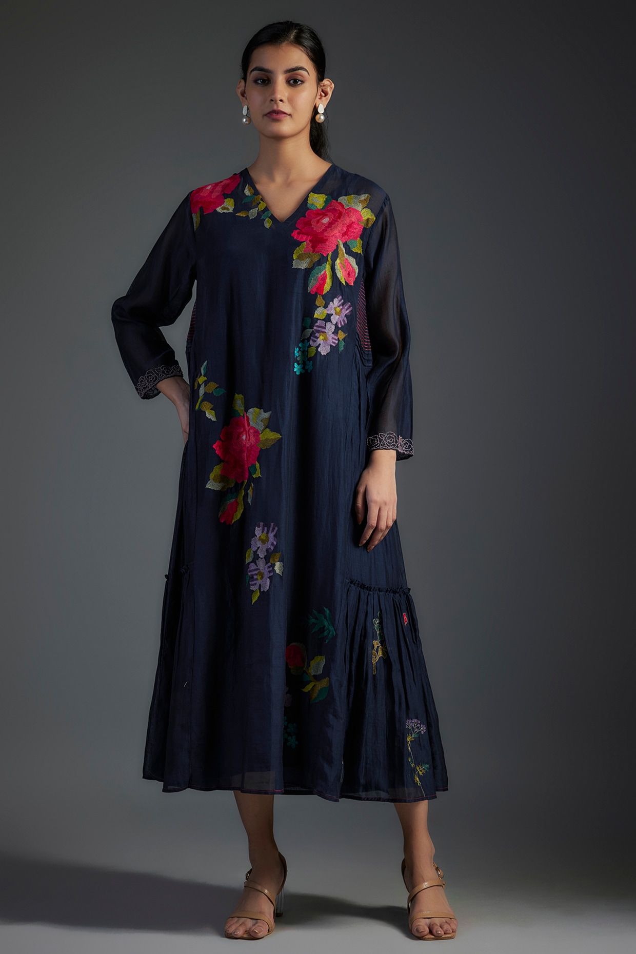 Blue Fine Chanderi Embroidered Midi Dress by Half Full Curve at Pernia