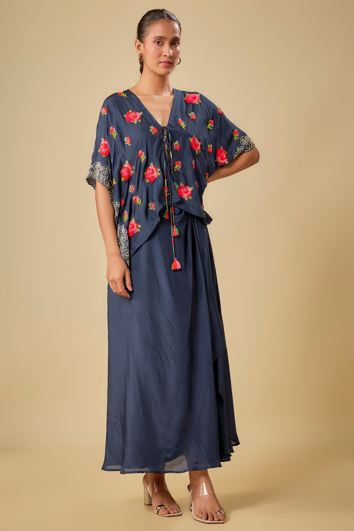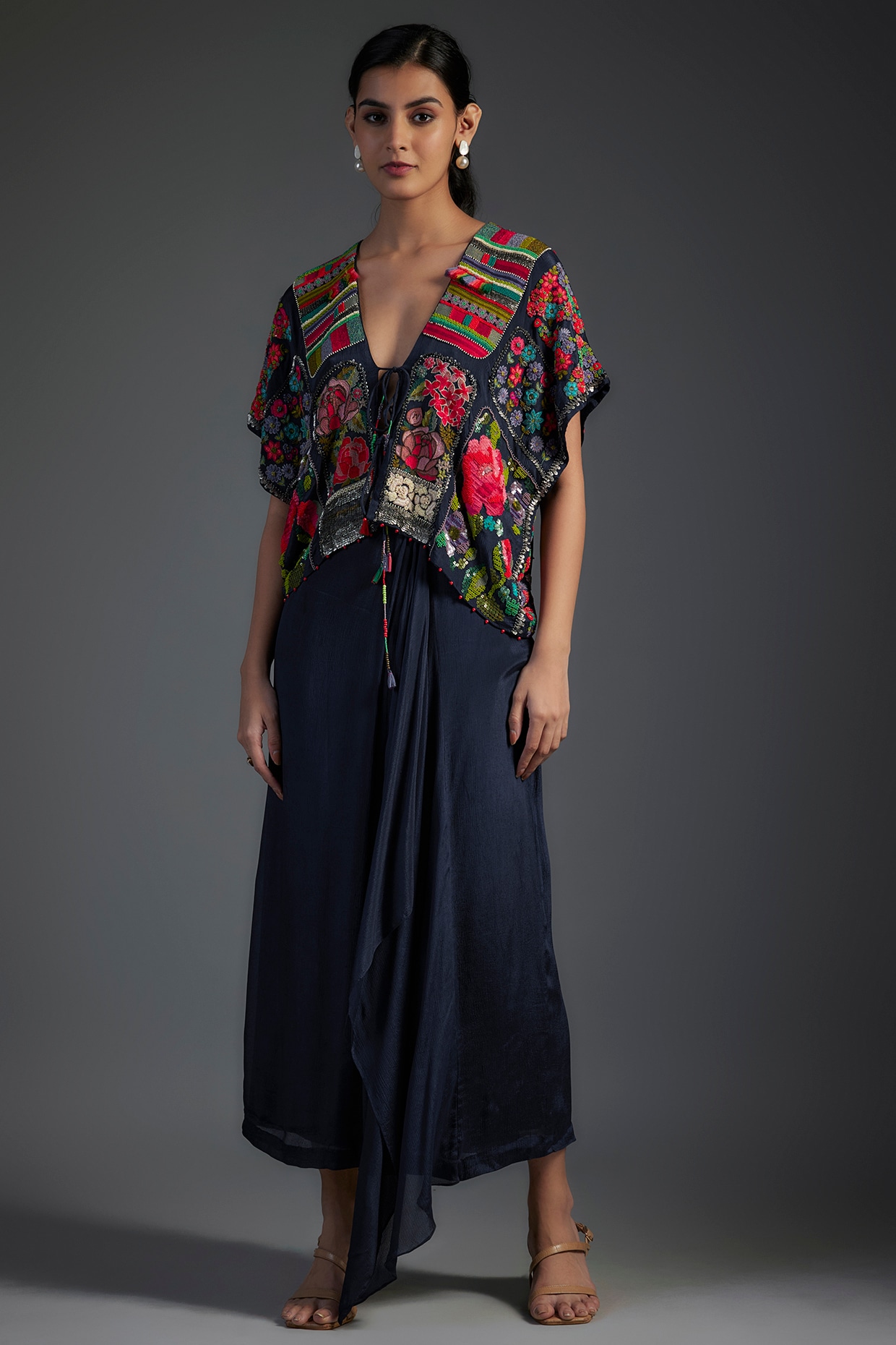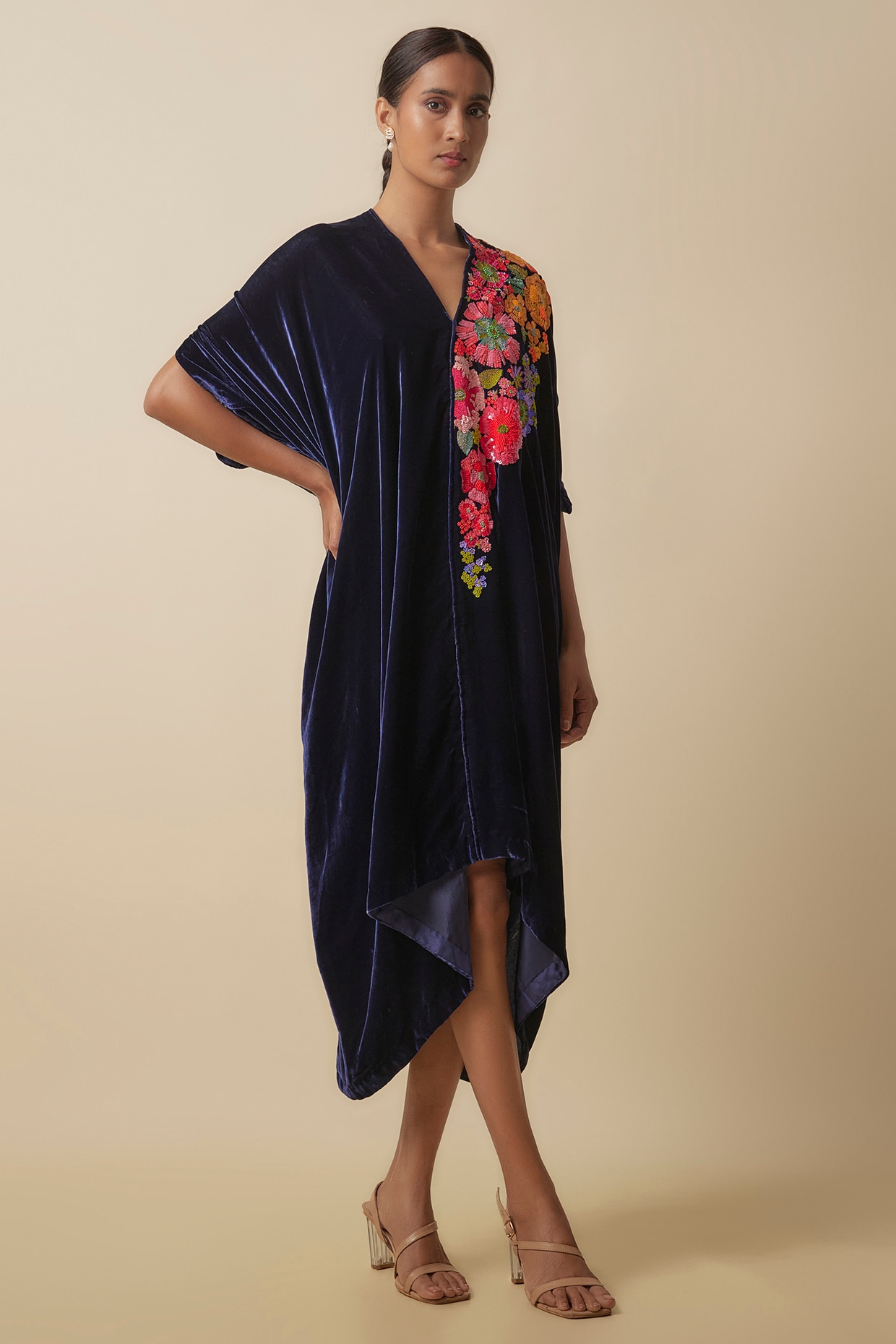 Blue Silk Velvet Hand Embroidered Draped Dress by Half Full Curve at